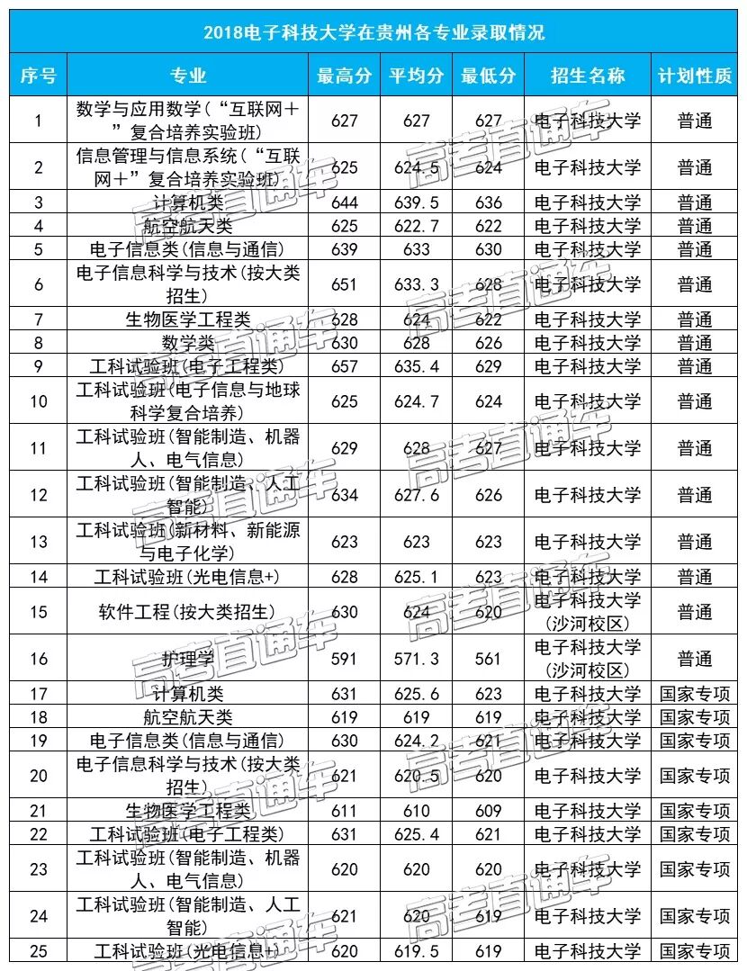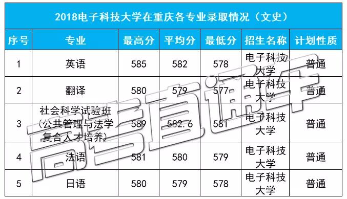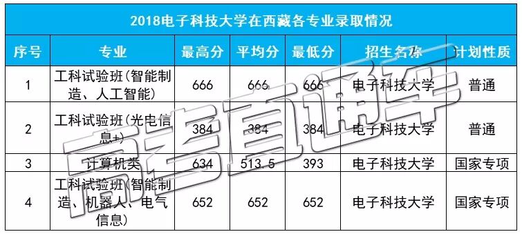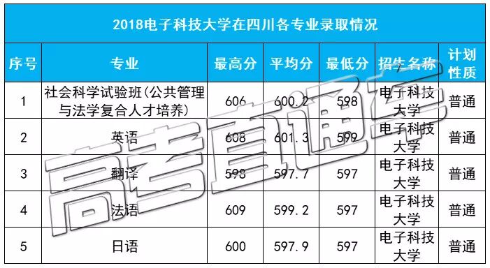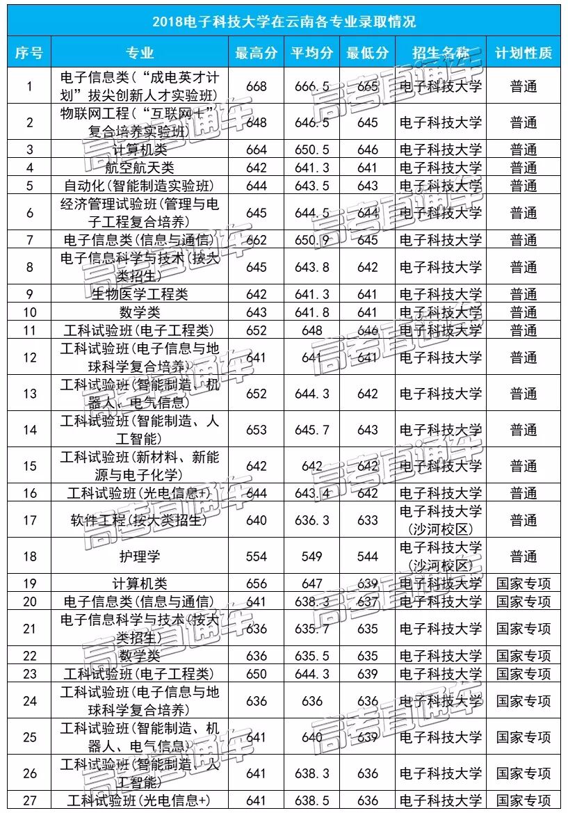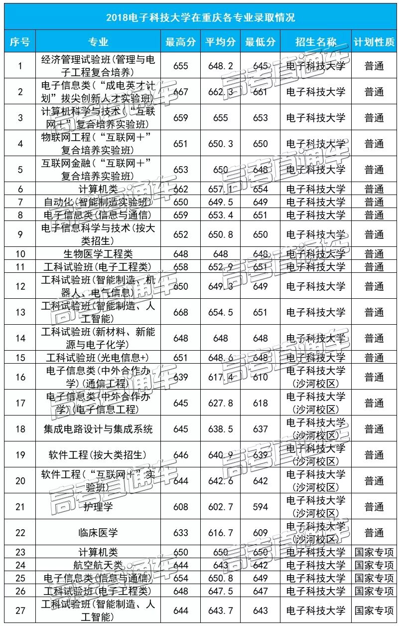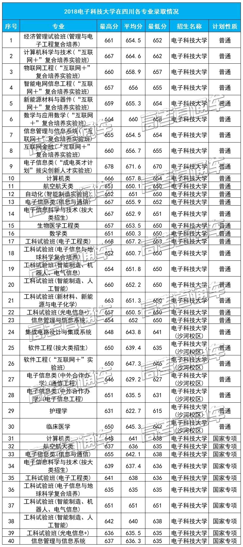 小西为大家找到了电子科技大学2018年在西南各地区的分专业分数线,大家可以看一下自己想报考的专业多少分才能上哦~(PS:电子科技大学官网没有在云南、贵州和西藏地区文科专业分数线的记录,所以云南、贵州和西藏的分专业分数线都是理工类的哦) 【理工】 从最高分来看,分数较高的专业为: 电子信息类(“成电英才计划”拔尖创新人才实验班):最高678分 工科试验班(电子工程类):668分 计算机科学与技术(“互联网+”复合培养实验班):667分 从最低分来看,分数较低的专业为: 护理学(沙河校区):615分 电子信息类(中外合作办学)(通信工程)(沙河校区):627分 电子信息类(中外合作办学)(电子信息工程)(沙河校区):631分 【文史】 从最高分来看,分数较高的专业为: 法语:609分 英语:608分 社会科学试验班(公共管理与法学复合人才培养):606分 从最低分来看,法语、日语、翻译最低分都是597分,社会科学试验班(公共管理与法学复合人才培养)为598分,英语为599分。 【理工】 【文史】 你还想看哪个学校呢? 欢迎留言。