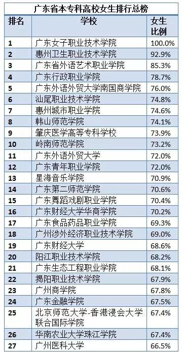教育厅的统计数据分析,广东141所高校普通本、专科生共179万人,其中女生94万人,占52.5%;研究生共8.6万人,其中女生4.1万人,占47.7%。