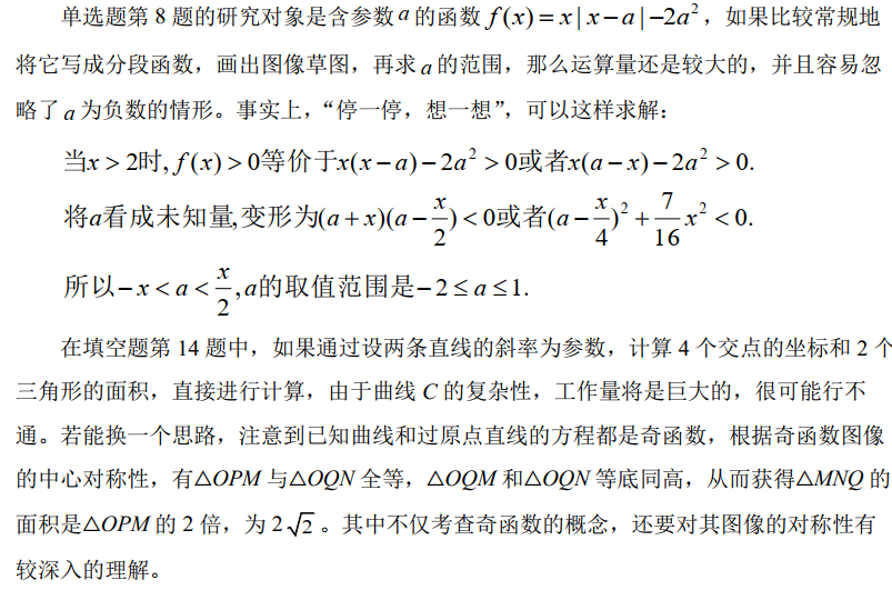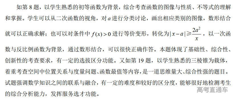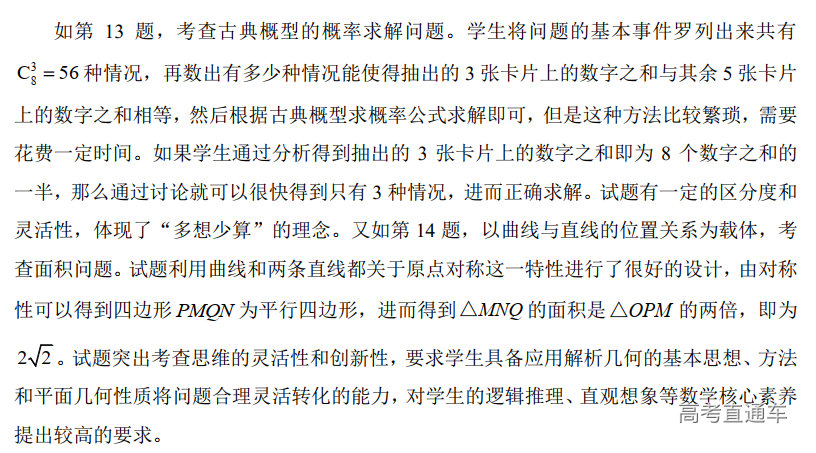保继光 北京师范大学数学科学学院教授 测试卷突出考查学生的思维品质和核心概念,引导高中数学教学遵循课程标准,突出基本目标,夯实学生学习基础,助力减轻学业负担,进一步促进素质教育的健康发展。 一、延续高考改革思路,注重思维品质的考查 在前四批21个省区市的新高考已平稳落地的基础上,测试卷既在整体上延续了几年来新高考数学试卷单选题、多选题、填空题、解答题的结构,也保持了2024年试卷的题型格局和赋分方案,分别为单选题8个(40分)、多选题3个(18分)、填空题3个(15分)、解答题5个(77分)。同时,测试卷控制了阅读总量,减少了繁琐运算,科学设计了试卷的难度梯度,延续了“多考想的、少考算的”的考查理念,尤其体现在单选题和填空题最后一题上。 以上两个例子的解法避免了繁难运算,简单明了,不易出错。这对于破解高中教学中存在的题海战术、机械刷题等顽症,提升高考试题对中学教学的导向作用具有积极的意义。 未来的高考要区分出真正具备数学素养、思维能力强的学生,而不是靠熟练度只会做套路题目的学生。测试卷表明,考生应该改变原有的应考观念,走出“多刷题、算得快”的误区。也可以看出,通过选择行之有效的方法简化计算,让考生能够有充分的时间进行思考,仍然是今后高考数学将坚持的改革方向。 二、引导高中数学教学,加强核心概念的考查 在《普通高中数学课程标准(2017年版2020年修订)》中,一共出现了159次“概念”这个词汇。第一个数学学科核心素养“数学抽象”主要包括:从数量与数量关系、图形与图形关系中抽象出数学概念及概念之间的关系,从事物的具体背景中抽象出一般规律和结构,并用数学语言予以表征。对于评价,建议“应聚焦数学的核心概念和通性通法,聚焦它们所承载的数学学科核心素养”。在命题原则中指出,“考查内容应围绕数学内容主线,聚焦学生对重要数学概念、定理、方法、思想的理解和应用”。 测试卷的大部分试题都强调核心概念和基本计算,引导高中教学扎实实施素质教育,使得“人人都能获得良好的数学教育,不同的人在数学上得到不同的发展”。前7个单选题题干简洁清晰、运算量小,根据相应的概念即可通过基本的计算获得结果。多选题由于得分的规则,对每一个选项均需做出判断。第9题需要熟悉抛物线的定义和基本性质,容易知道A、B、C是正确的,排除D则需要稍微计算一下。第10题主要判别单调性,借助导数,容易得知A、C是对的,B是错的;再根据双曲正切的定义,也易知D是对的。第12题涉及指数和对数的运算,第13题是一个简单的古典概型问题,均考查基本概念和相应的基本计算。第15题是基本的统计计算问题。第16题按照等比数列的定义展开论证即可。第17题研究函数的切线,关注极值的局部性。测试卷试题的每一问基本都离不开对核心概念的理解。 当代认知学习理论的代表人物布鲁纳(Bruner)认为,掌握一门学科就是要掌握这门学科核心的、根本的概念。李邦河院士指出,数学根本上是玩概念的,不是玩技巧,技巧不足道也;在一些难题、技巧上下功夫,恰恰是舍本逐末的做法。概念是人类智慧的结晶,是数学理论和数学框架的奠基石,无论是传授数学知识,还是培养能力,都必须以数学概念为基础和前提。更重要的是在认识概念本质属性的过程中,借助观察、对比、辨析、抽象、概括等数学思维活动,发展学生抽象思维和推理能力,感悟数学思想方法,进而有效地应用概念解决问题,提升数学学科核心素养。 第18题考查椭圆的要素、椭圆与直线的位置关系,以及动点的轨迹。第19题是关于立体几何的,主要关心平面的位置关系和数量关系,需要一定的空间想象能力。第18(3)、19(2)题虽有一定的计算量,但都是常规的。 测试卷符合“依标命题、源于教材”的命题理念,强化与课标、教材的衔接,引导一线教学回归课标、回归课堂主渠道,引导一线教学讲透教材内容,注重减量提质,与高中数学教学同向同行、同频共振,对数学高考改革又做了一次有益的尝试,对教育评价具有积极的导向作用。 2024年8月6日,中共中央、国务院发布了《关于弘扬教育家精神加强新时代高素质专业化教师队伍建设的意见》,强调要提高教师学科能力和学科素养,将学科能力和学科素养作为教师教书育人的基础,贯穿教师发展全过程。教学经验的积累的确可以让教师的教学变得更加成熟,但未必能决定他们教育的高度,决定教师教育高度的根本因素是教师的学科能力和学科素养。在高中数学教学过程中,教师要认真备课,而不是背课,不仅能将教学内容流畅地讲出来,更重要的是将其中的思维流畅地展示出来;要将每一个耳熟能详的概念当成新概念讲解,尽可能有逻辑地展开论述。这样才能把学生的数学思维教出来,数学素养培养出来。