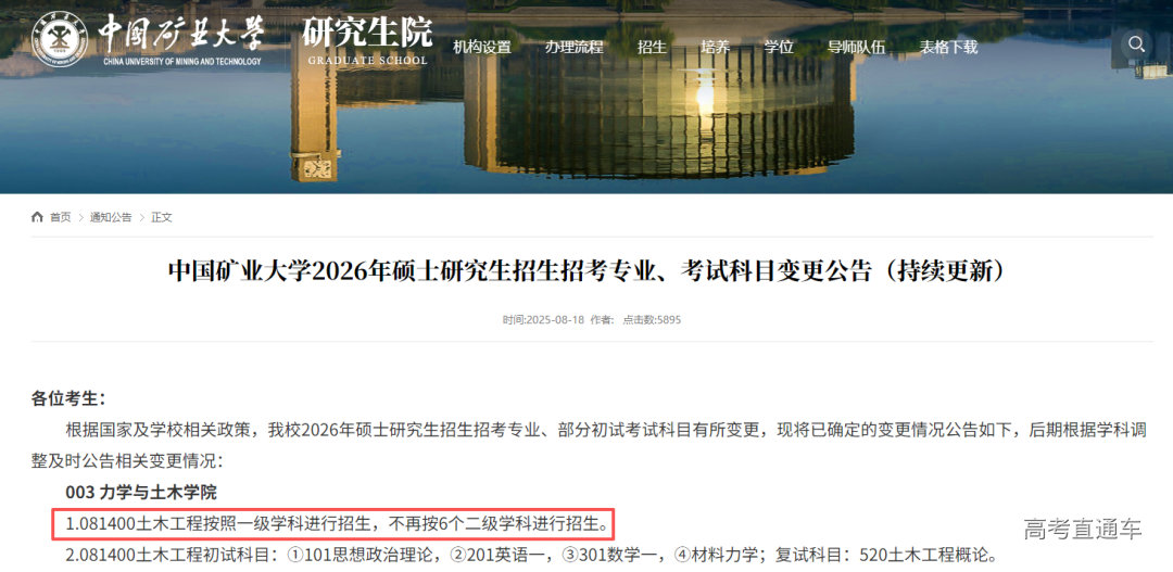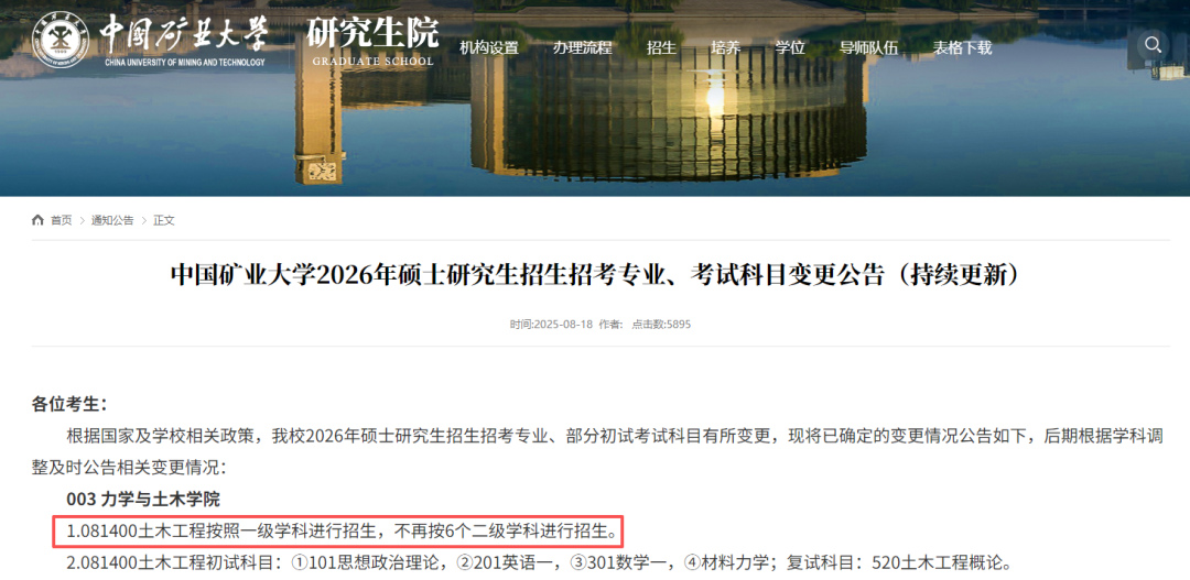 同样,中国矿业大学2026年硕士研究生招生招考专业、考试科目变更公告显示:土木工程按照一级学科进行招生,不再按6个二级学科进行招生(岩土工程、结构工程、市政工程等)。