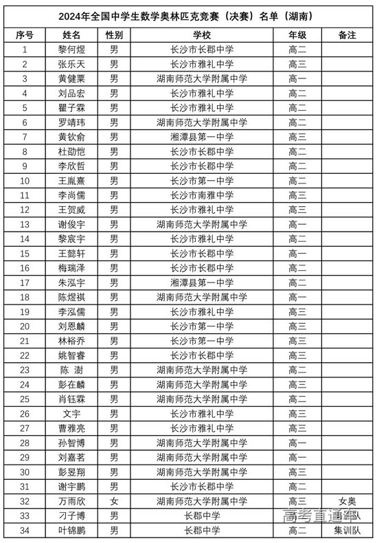 2024年第40届全国中学生数学联赛省队名单(湖南)