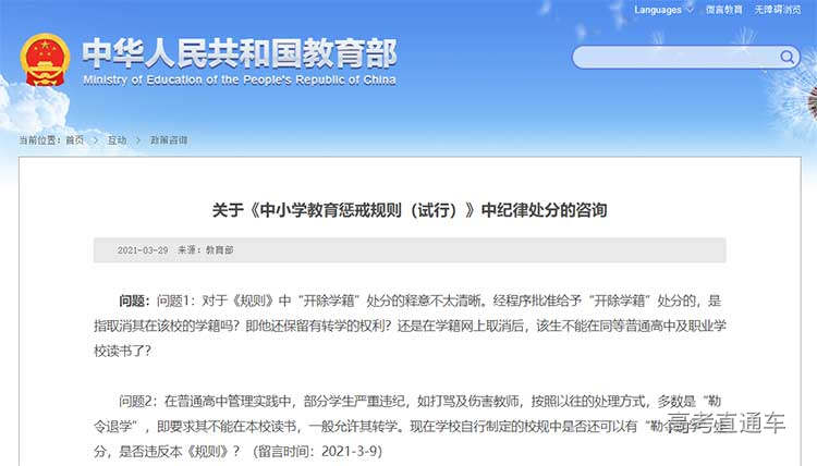 《中小学教育惩戒规则》(以下简称“《规则》”)3月1日起正式实施。近日有网友对《规则》中“开除学籍”处分的规定存在疑问,教育部对此进行官方答复。