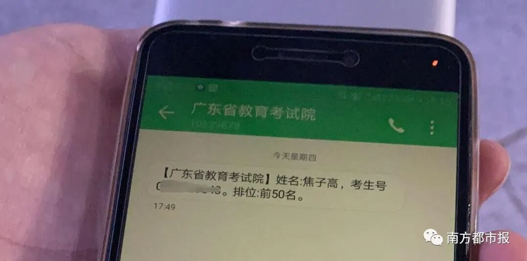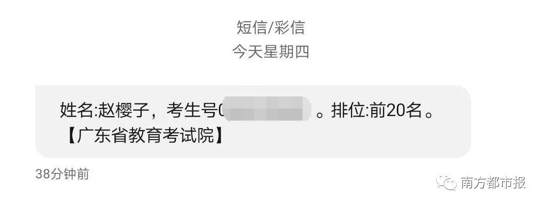 今天(7月23日)下午6点左右,深圳中学文科毕业生赵樱子收到了广东省教育考试院的通知:排位前20名。