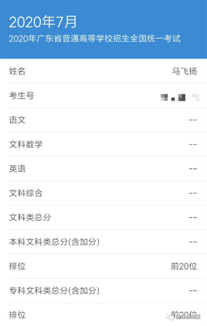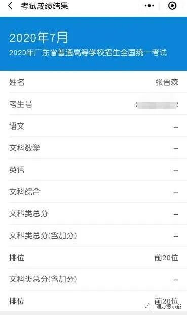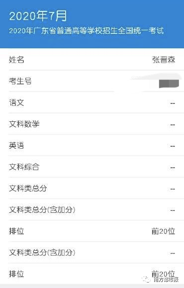 深圳高级中学文科生,来自高三(20)班的张晋森同学,在今年高考中被屏蔽成绩,成绩排在广东省前20名。