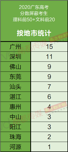 广东21地市中,有11个地市出现了分数被屏蔽的考生。其中,广州最多,有15人,随后是深圳11人,佛山、东莞各有9人,一东一西的汕头和湛江,各有7人、6人,惠州、中山、阳江、珠海、河源则各有1-4人。