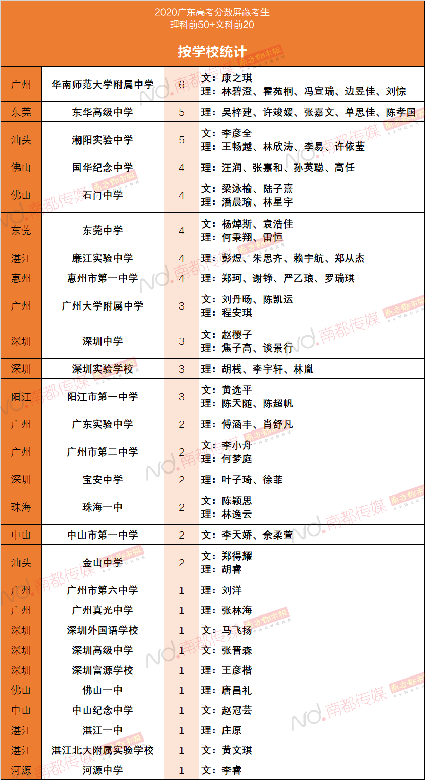 东莞中学、惠州一中、佛山国华纪念中学、佛山石门中学、湛江廉江实验学校分别有4人分数被屏蔽;广大附中、深圳中学、深圳实验学校、阳江一中分别有3人分数被屏蔽。