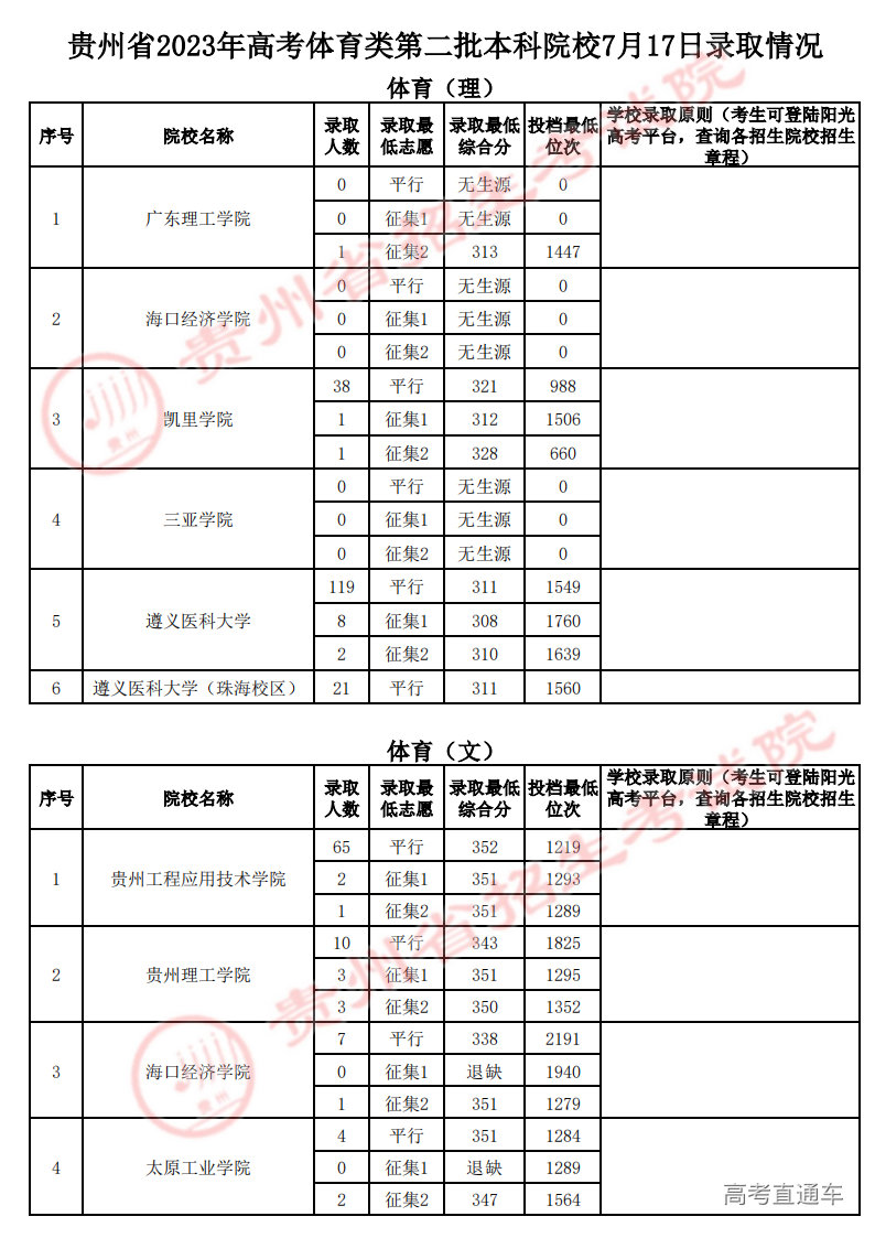 贵州省2023年高考体育类第二批本科院校7月17日录取情况