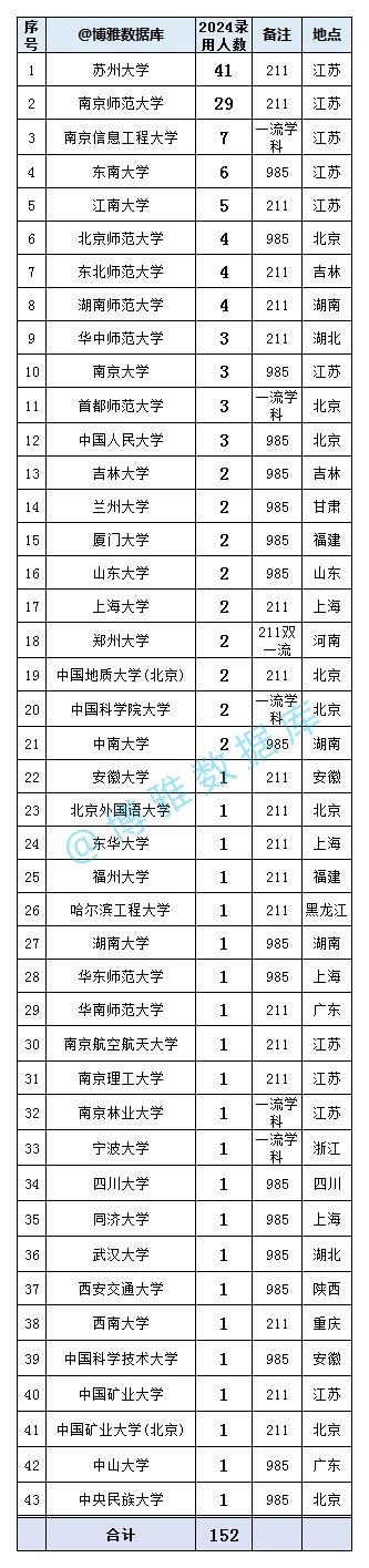 生源高校43所。其中苏州大学、南师大录用人数相对较多。