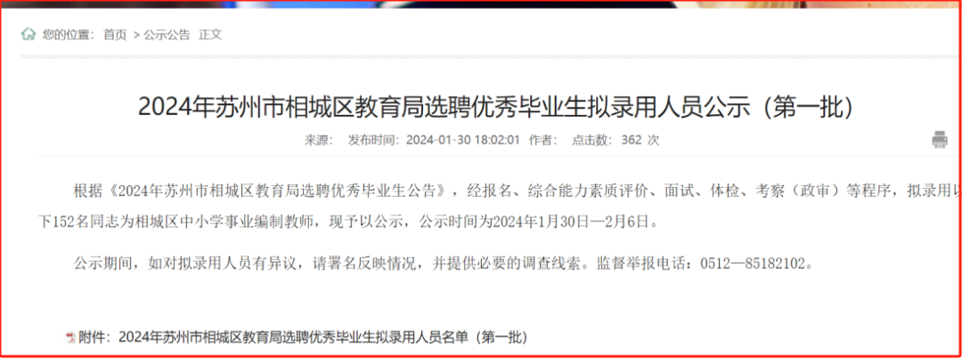 根据2024年苏州市相城区教育局选聘优秀毕业生拟录用人员公示(第一批),