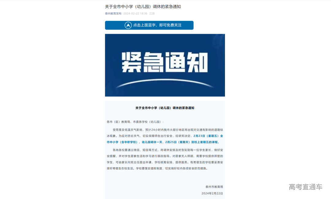 泰州市教育局:受雨雪及低温天气影响,预计24小时内我市大部分地区将出现对交通有影响的道路结冰现象。为应对恶劣天气,切实保障师生出行安全,经研究决定,2月23日(星期五)全市中小学(含中职学校)、幼儿园调休一天,2月25日(星期天)到校上星期五的课程。