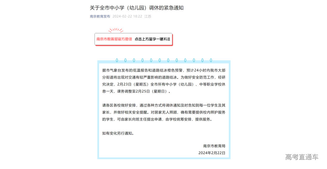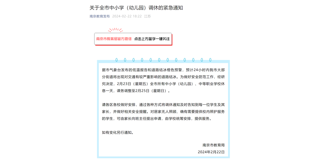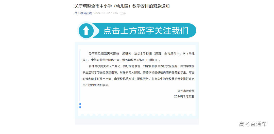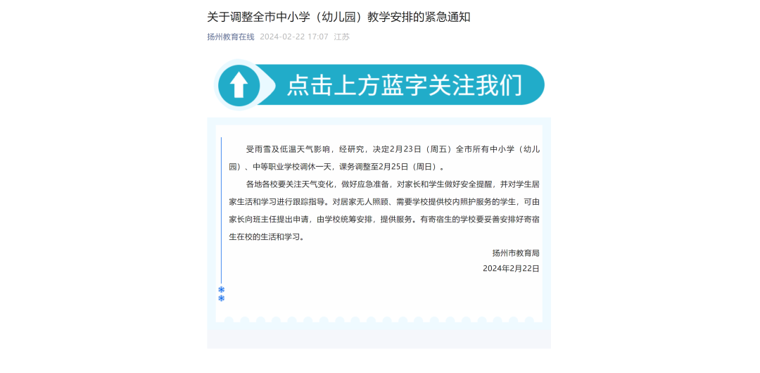 扬州市教育局:受雨雪及低温天气影响,经研究,决定2月23日(周五)全市所有中小学(幼儿园)、中等职业学校调休一天,课务调整至2月25日(周日)。