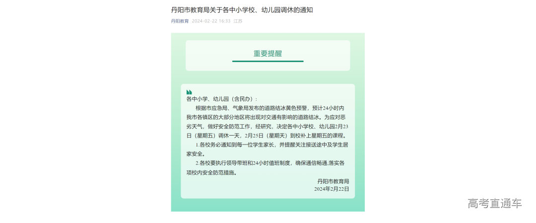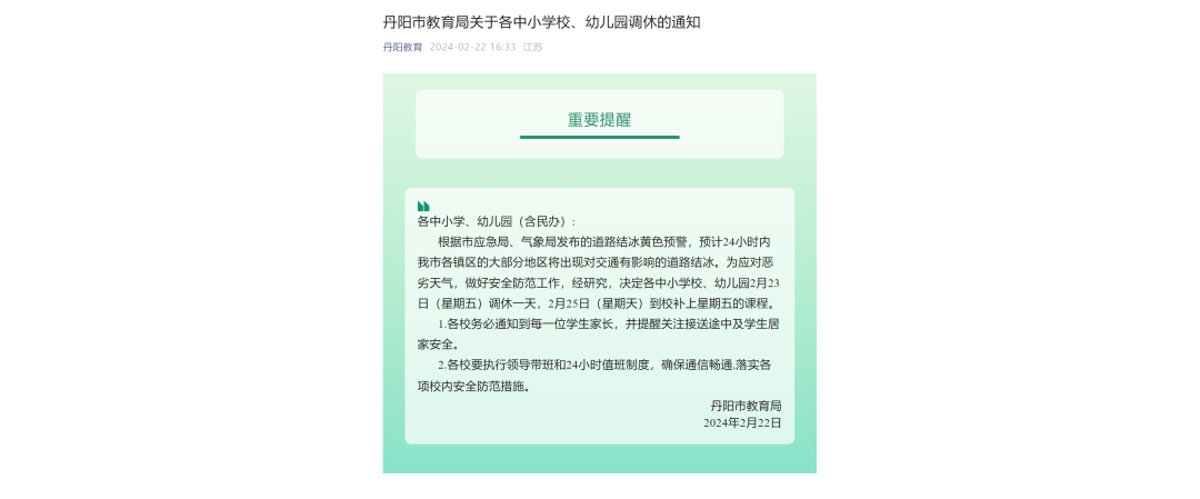 丹阳市教育局:根据市应急局、气象局发布的道路结冰黄色预警,预计24小时内我市各镇区的大部分地区将出现对交通有影响的道路结冰。为应对恶劣天气,做好安全防范工作,经研究,决定各中小学校、幼儿园2月23日(星期五)调休一天,2月25日(星期天)到校补上星期五的课程。