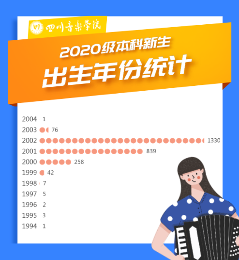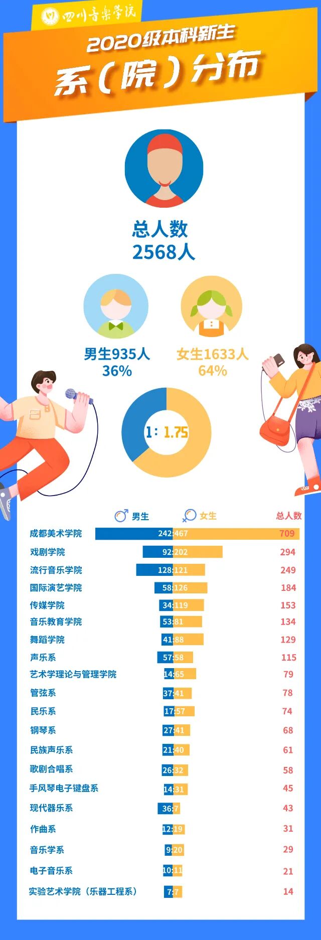 川音2020级本科新生共有2568名,其中有935名小哥哥和1633名小姐姐,男女生人数比例接近1:1.75。