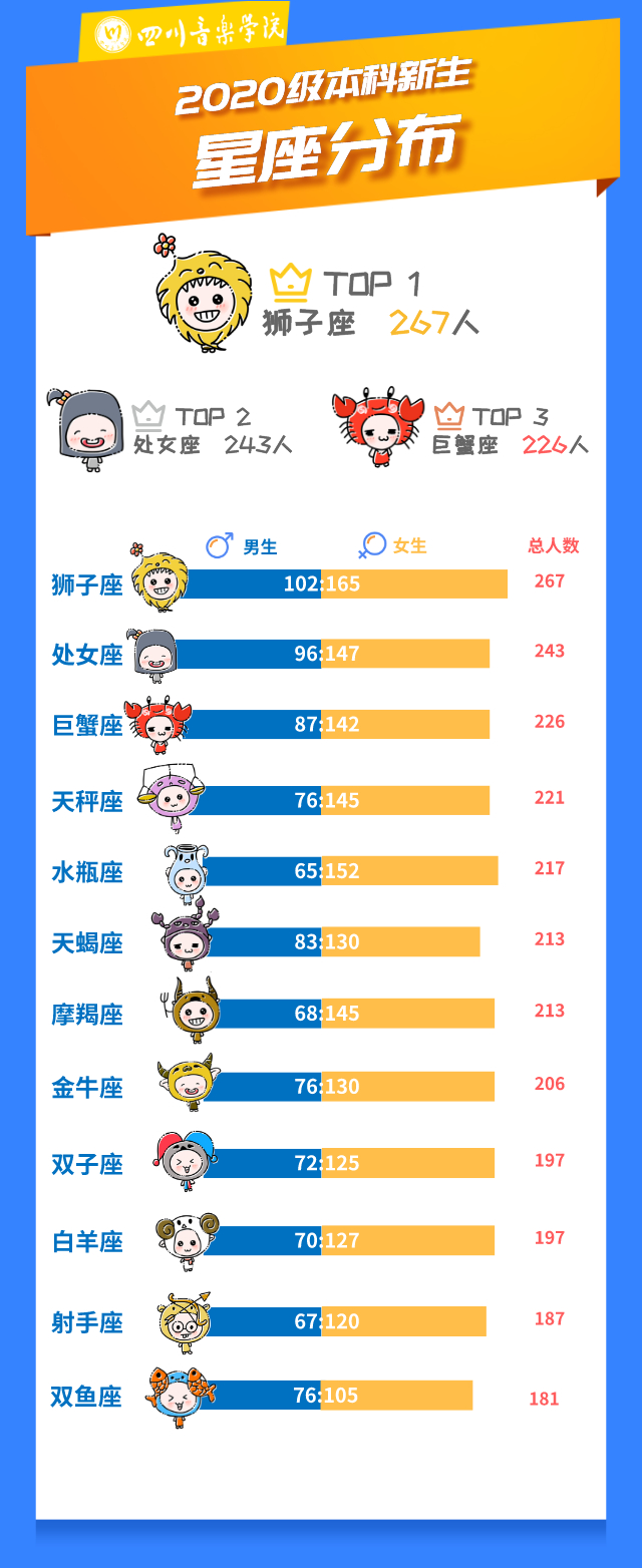 在新生中,年龄最大的和最小的相差10岁。狮子座再次问鼎人数占比最高的星座,处女座与巨蟹座以微弱差距紧随其后。