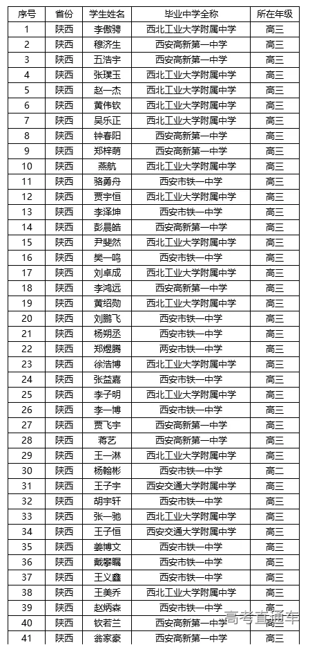 陕西省2019年第36届全国中学生物理竞赛省一名单