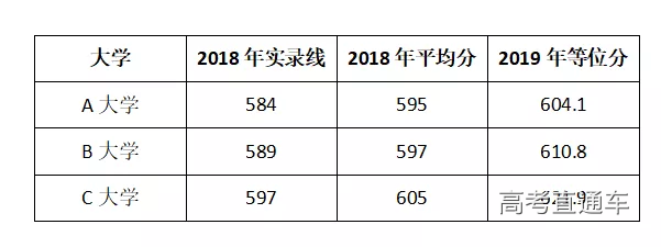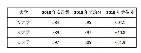 根据等位分查询可知,三所大学去年的录取分数换算成等位分之后,分别对应今年高考录取成绩为604分至621分不等。