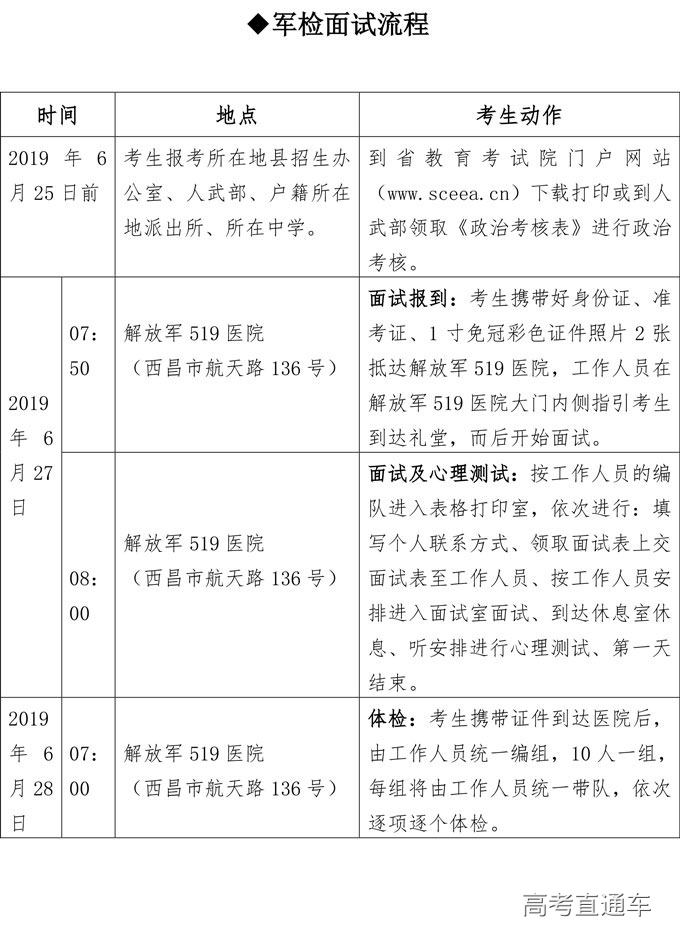 2、考生参加军检面试前务必携带好身份证、准考证、2张1寸的彩色照片 ,建议凉山片区较远地方的考生于2019年6月26日到达西昌。