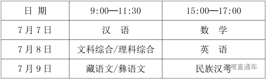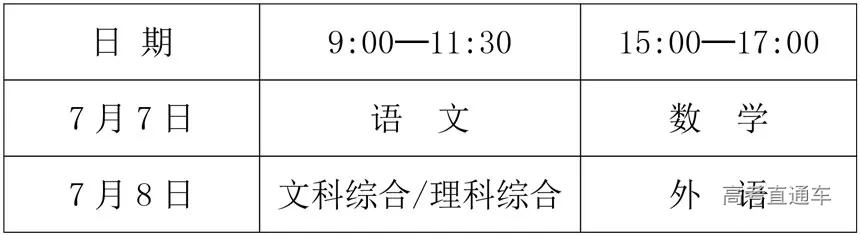 2.全省高考(一类模式高考除外)于7月7、8日统一组织进行。各科目考试时间(北京时间)安排如下: