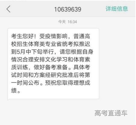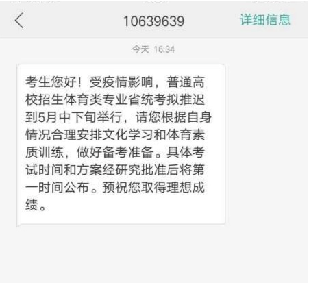考生您好!受疫情影响,普通高校招生体育类专业省统考拟推迟到5月中下旬举行,请您根据自身情况合理安排文化学习和体育素质训练,做好备考准备。具体考试时间和方案经研究批准后将第一时间公布。预祝您取得理想成绩。
