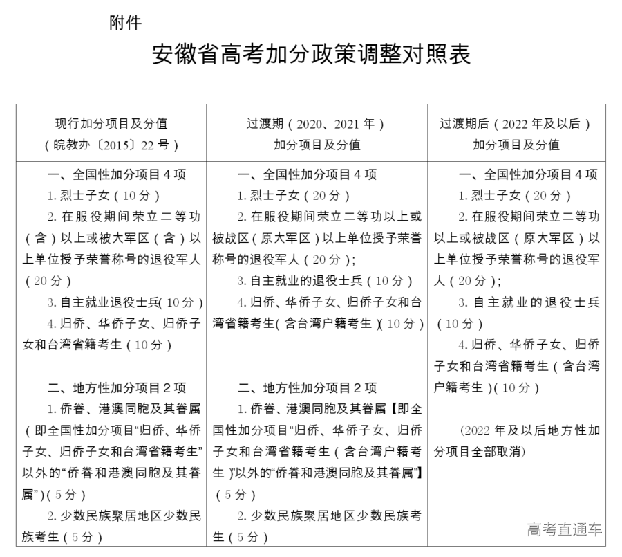 (二)逐步取消2项地方性加分项目。自2022年起,取消“侨眷、港澳同胞及其眷属”【即全国性加分项目“归侨、华侨子女、归侨子女和台湾省籍考生(含台湾户籍考生)”以外的“侨眷和港澳同胞及其眷属”】和“少数民族聚居地区少数民族考生”两项地方性加分项目。2020、2021年符合条件的高考考生仍具有加分资格,加分分值为5分,仅适用于我省省属高校招生。