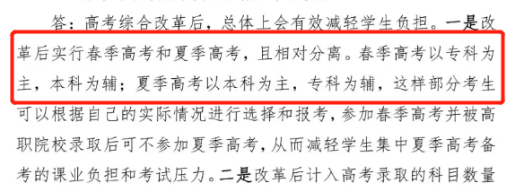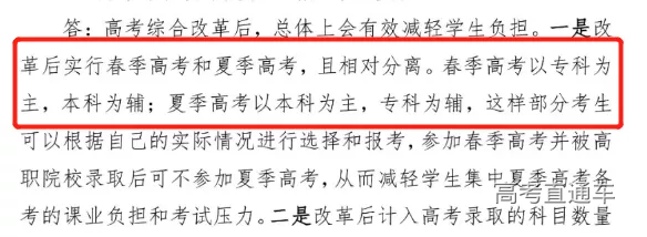广东省教育考试院此前发布的《新高考综合改革政策解读》中提到,高考综合改革后,春季高考以专科为主,本科为辅;夏季高考以本科为主,专科为辅。