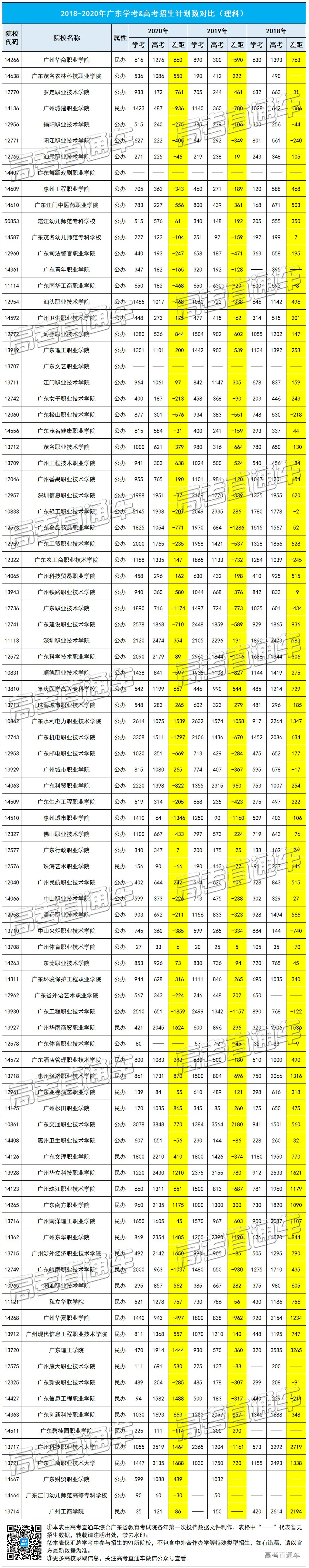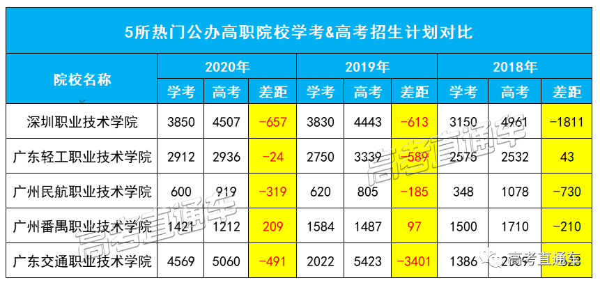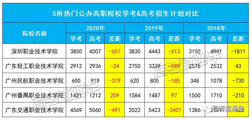 注:本表统计了广东省内高职院校(87所)及在学考中参与招生的4所本科高校(广东理工学院、广州工商学院、广州科技职业技术大学、广东工商职业技术大学) 本表学考录取及高考招生计划数据摘取自广东省教育考试院公布的第一次投档数据的计划数,不包括中外合作办学等特殊类型招生。如有疏漏,请以官方公布数据为准。 文科 理科 总体来看,大部分高职院校的学考录取招生计划呈现逐年增加的趋势,夏季高考招生计划逐年减少。而且从2019年起,安排在学考录取的招生计划数反超夏季高考的招生计划数。 不同层次院校招生计划变化如下: 1.热门公办院校 在历年学考录取中,像深圳职业技术学院、广东轻工职业技术学院、广州民航职业技术学院等热门公办院校都是深受考生们的青睐的,投档非常火爆,投档分也相对较高。 其安排在夏季高考的招生计划数高于学考录取,主要是因为通过学考录取考上优质公办院校的部分本科线上考生,在夏季高考中顺利被本科批次院校录取,自动放弃专科录取资格,而空出的这部分计划,便安排在夏季高考中继续招生。(取以下5所院校为例) 这也说明,参加学考录取可以帮助同学们“保专冲本”,考过了,没有后顾之忧,还能更加有信心去冲本科。在2019年夏季高考中,就有超一万学考生被本科批次院校录取。 2.普通公办院校和优质民办院校 大部分公办院校和像广州城建职业学院这类优质民办院校,其安排在学考录取中的招生计划数高于安排在夏季高考中的招生计划数。 出现这种情况的原因之一是,学考录取已经占据了院校的大部分招生计划,并且由于这部分院校在学考录取中提前完成了大部分招生计划,没有多余招生计划分配到夏季高考,就导致在夏季高考录取中仅剩少量招生计划数。 3.普通民办院校 此外,较多民办院校安排在夏季高考的招生计划数比学考录取多。 由于这部分民办院校在学考录取中仅有少量考生投档,仍剩大量缺额计划,这些缺额的计划,除了安排在补录中继续招生,剩余的会留在夏季高考录取中完成。这就导致在夏季高考中,民办院校招生计划居多,且高于安排在学考录取中的招生计划数。 原因一、招生计划逐年扩大,上线率高 由上述分析可以看出,各院校在学考录取中投放的招生计划逐年增加,考生通过学考录取考取专科的机会比夏季高考多,考上公办专科院校的机会更大,竞争相对没有夏季高考那般激烈。 虽说学考录取尚未完成的招生计划会放到夏季高考,但往往只有民办专科院校在学考录取中,不能完成招生计划。 随着高考报考人数不断增加,公办院校将仍会是“僧多肉少”、竞争激烈。在学考中低分就能进的院校,在夏季高考中高分都未必能上。 原因二、备考压力小 对于成绩在本科线下的高考生来说,春季高考是一种解脱。如果能够被顺利录取,就可以免受夏季高考的备考压力,更不必因为害怕辜负家长的期望而焦虑。 对于成绩在本科线上徘徊的考生来说,春季高考就是一个保专冲本的好机会。考过了,没有后顾之忧,更有信心去冲刺本科。 原因三、考试难度小 小高考(语数英学考),顾名思义,只考语、数、英三科,分值为每科100分,共300分。(注:2021年起总分为450分) 其在题量、考试范围和难度上都远远低于高考,学习基础较弱的考生也能轻松考出180分的成绩(总分300分)。 2020年广东学考录取中,220分左右就能考上清远职业技术学院、广东司法警官职业学院等热门公办专科院校。(总分300分) 240分左右就能考上广东交通职业技术学院、广州铁路职业技术学院等每年报考人数爆棚的热门公办专科院校。(总分300分) 毫不夸张地说,春季高考简直是是低分党、基础比较差的考生的福音。