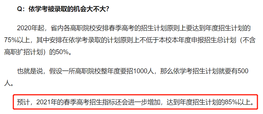 根据南方+11月8日最新消息,“预计,2021年的春季高考招生指标还会进一步增加,达到年度招生计划的85%以上”,这意味着,夏季高考省内专科院校的计划或不足年度总计划的15%! 注:具体高考招生计划以考试院官方公布为准
