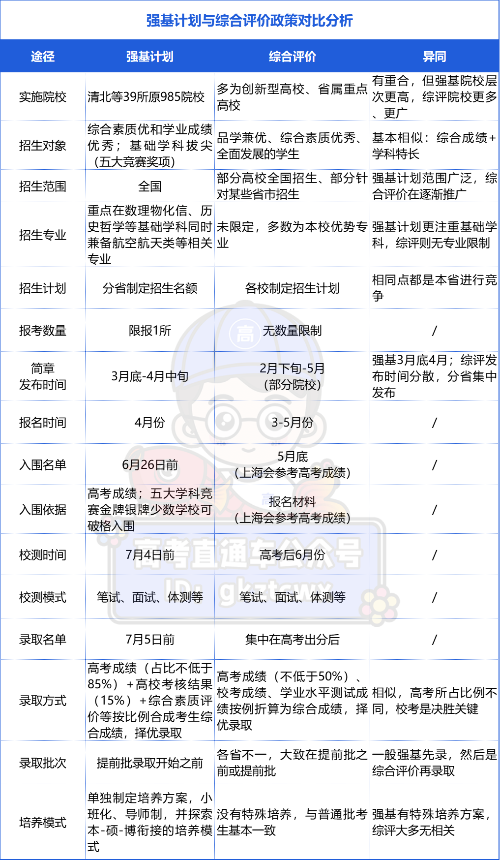 通过上表,我们能看出强基计划和综合评价在招生方式上有相同之处,关于二者的详细异同点需要我们逐一进行分析。