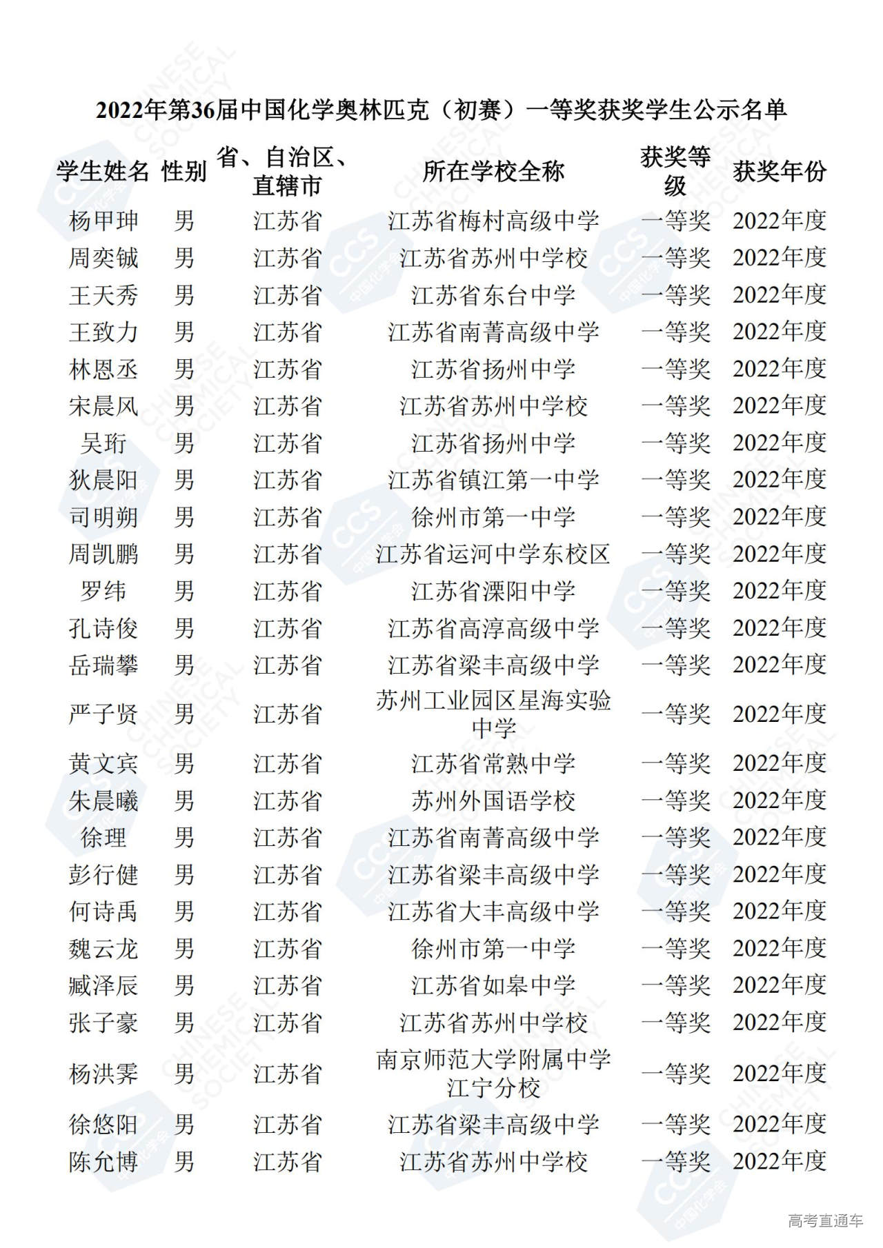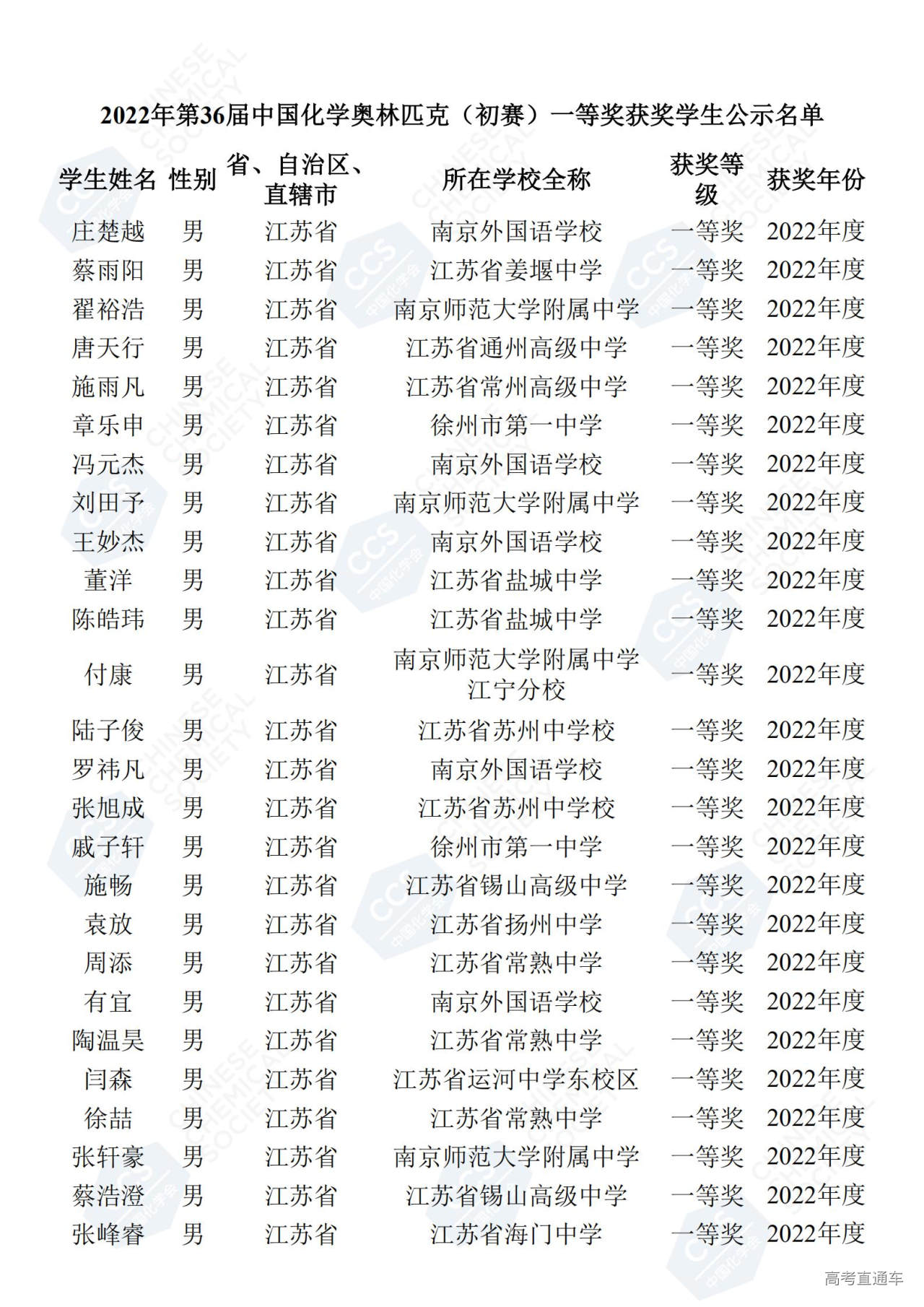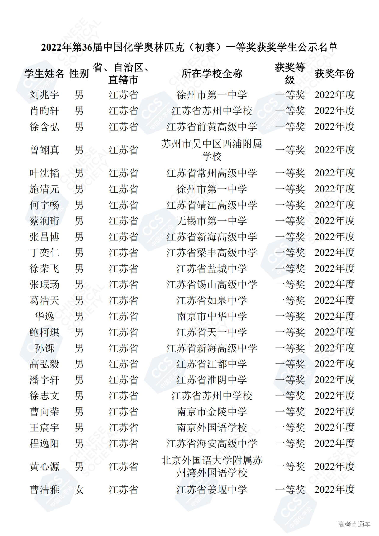 第36届全国中学生化学竞赛初赛省一获奖名单(江苏赛区)