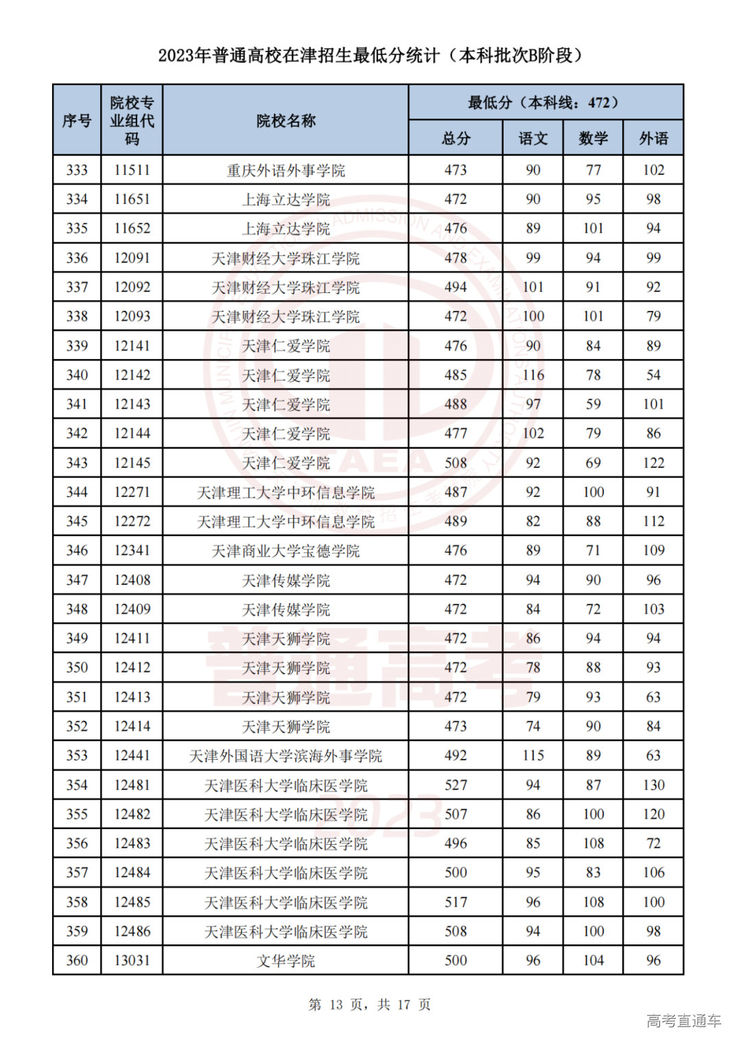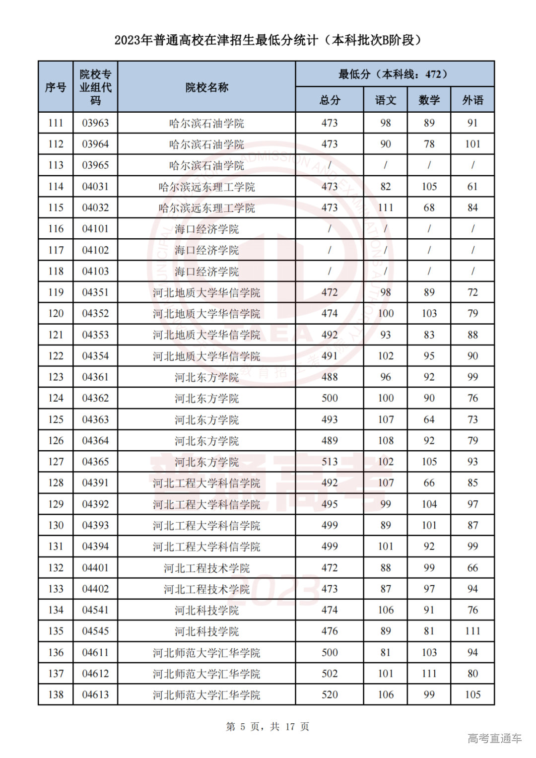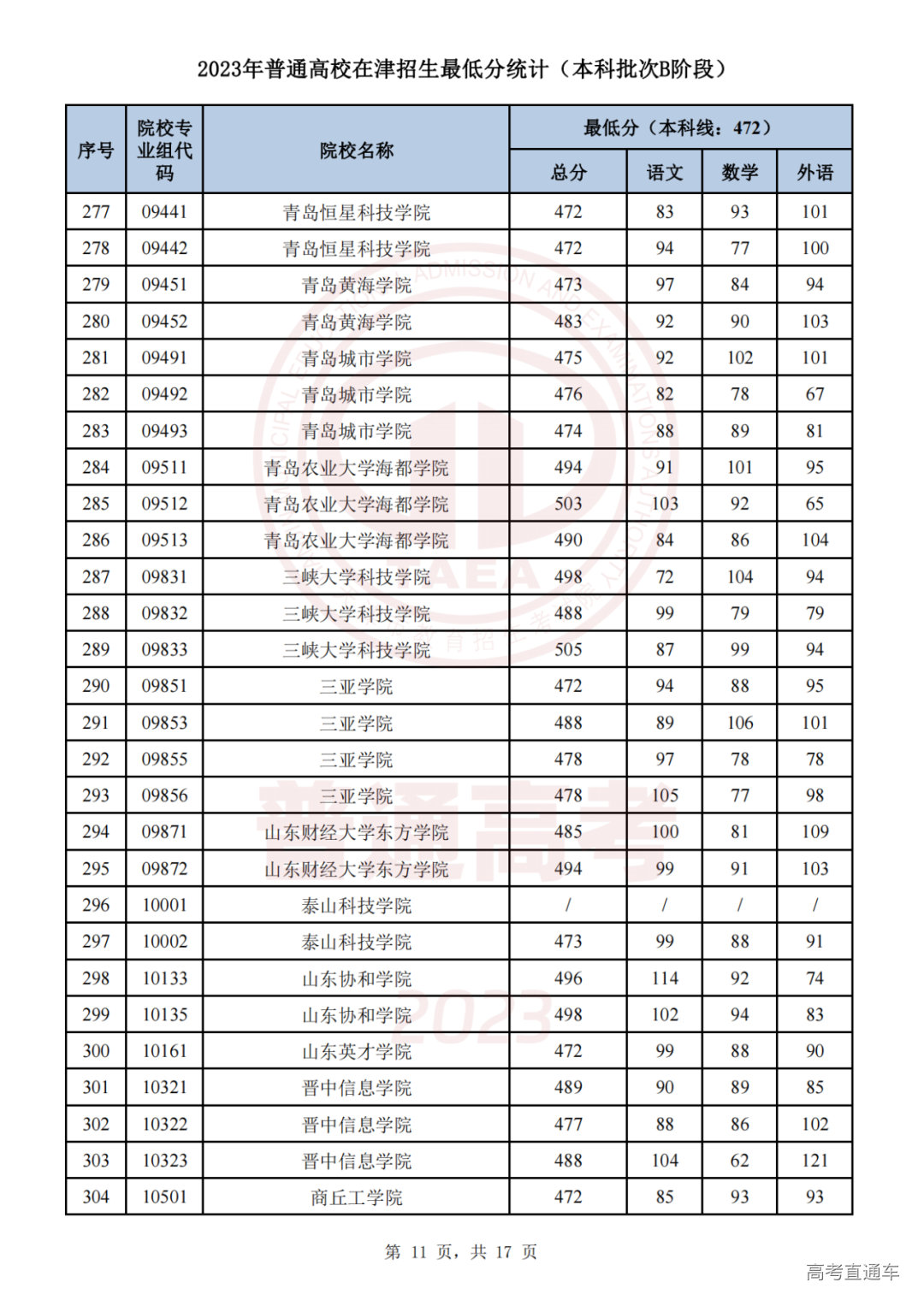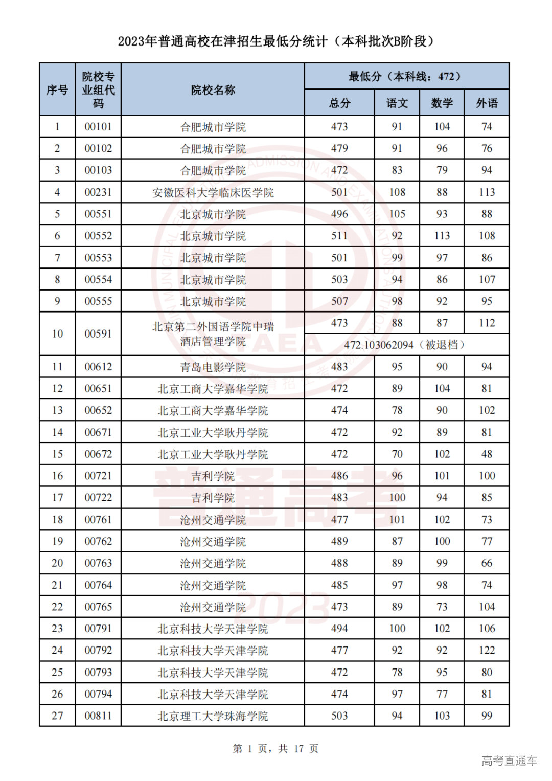 1.2023年普通高校在津招生最低分统计(本科批次B阶段)