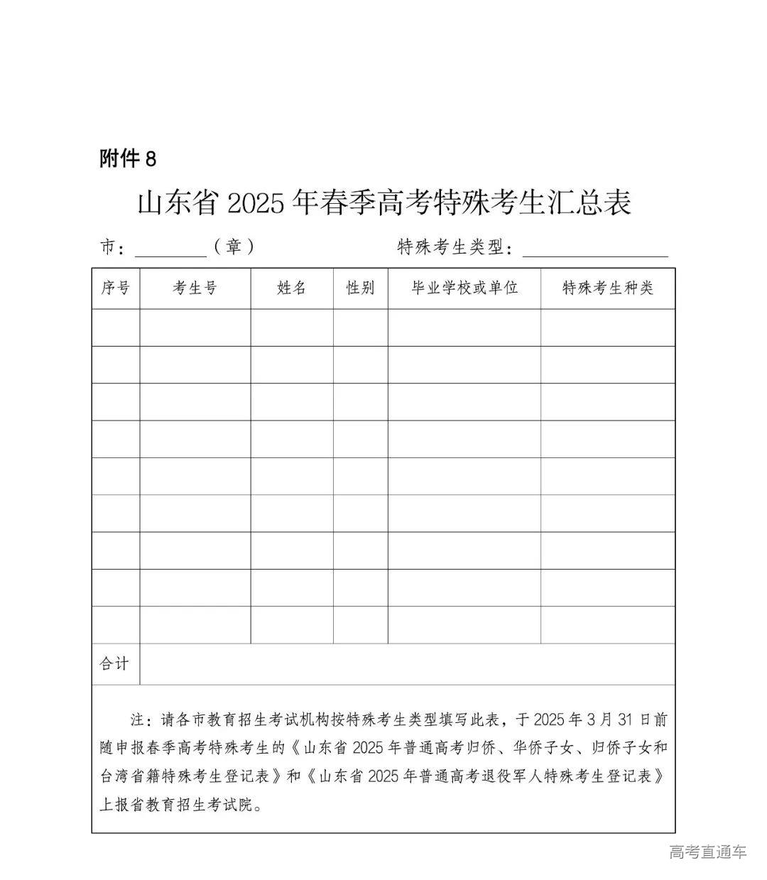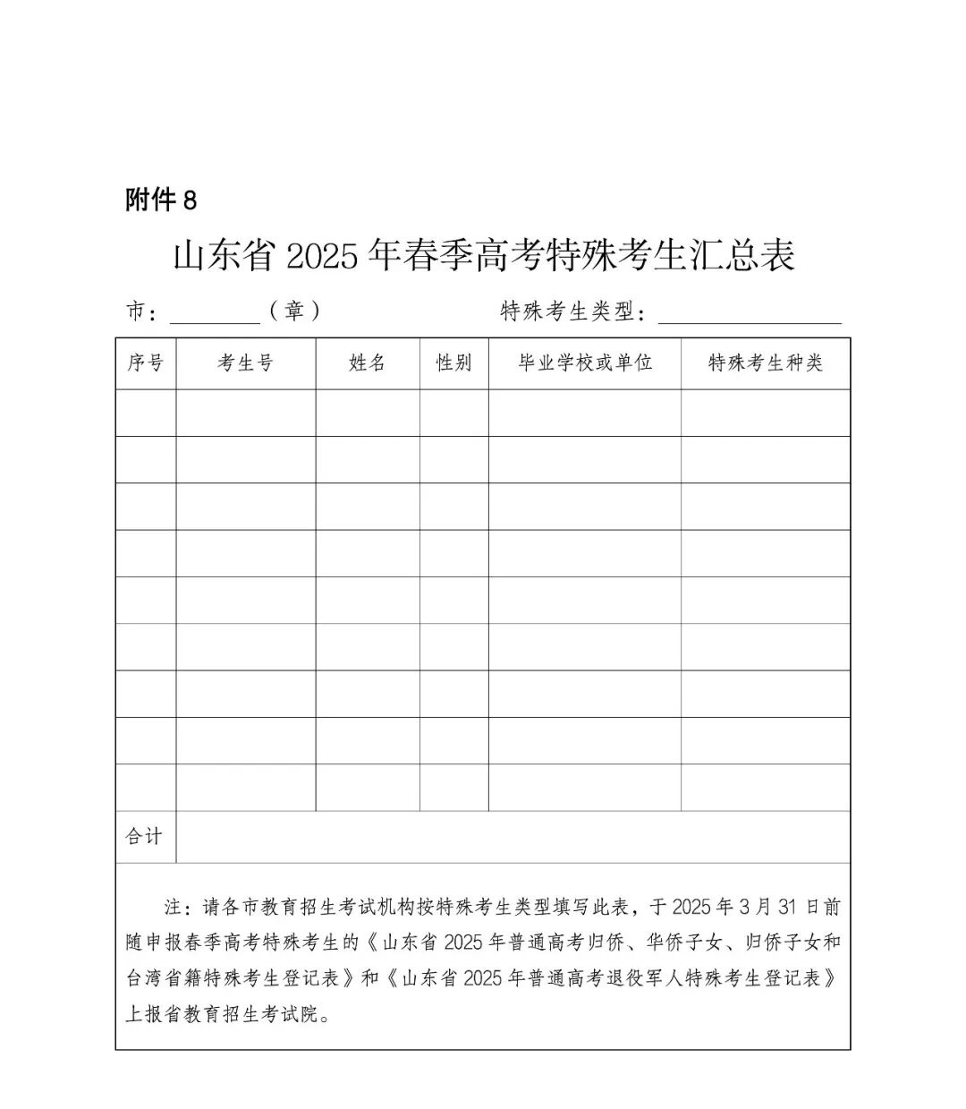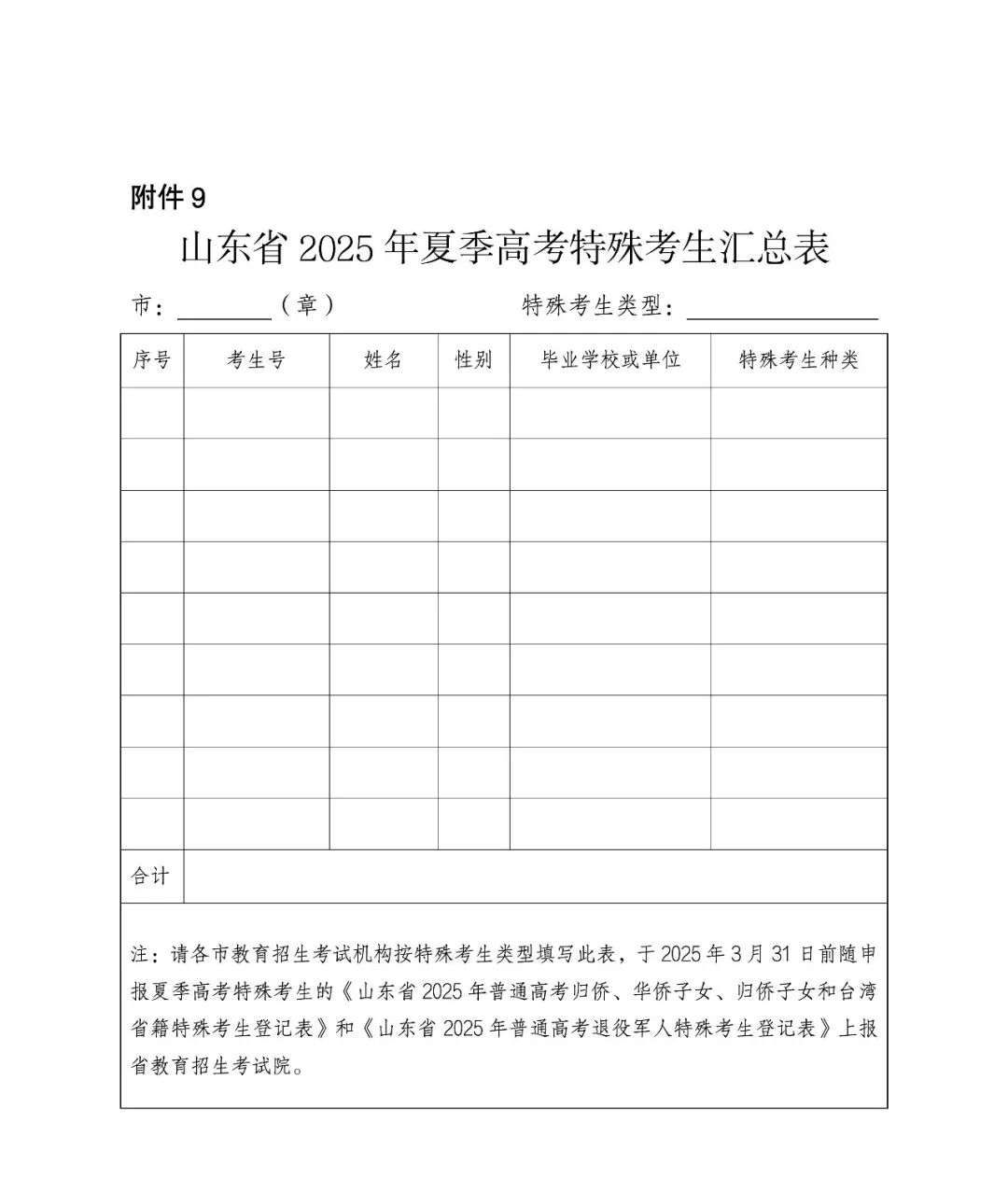 《山东省2025年夏季高考特殊考生汇总表》(附件9)、各类申请享受高考录取照顾政策考生的登记表及相关证明材料的电子版区分春季高考和夏季高考报省教育招生考试院。