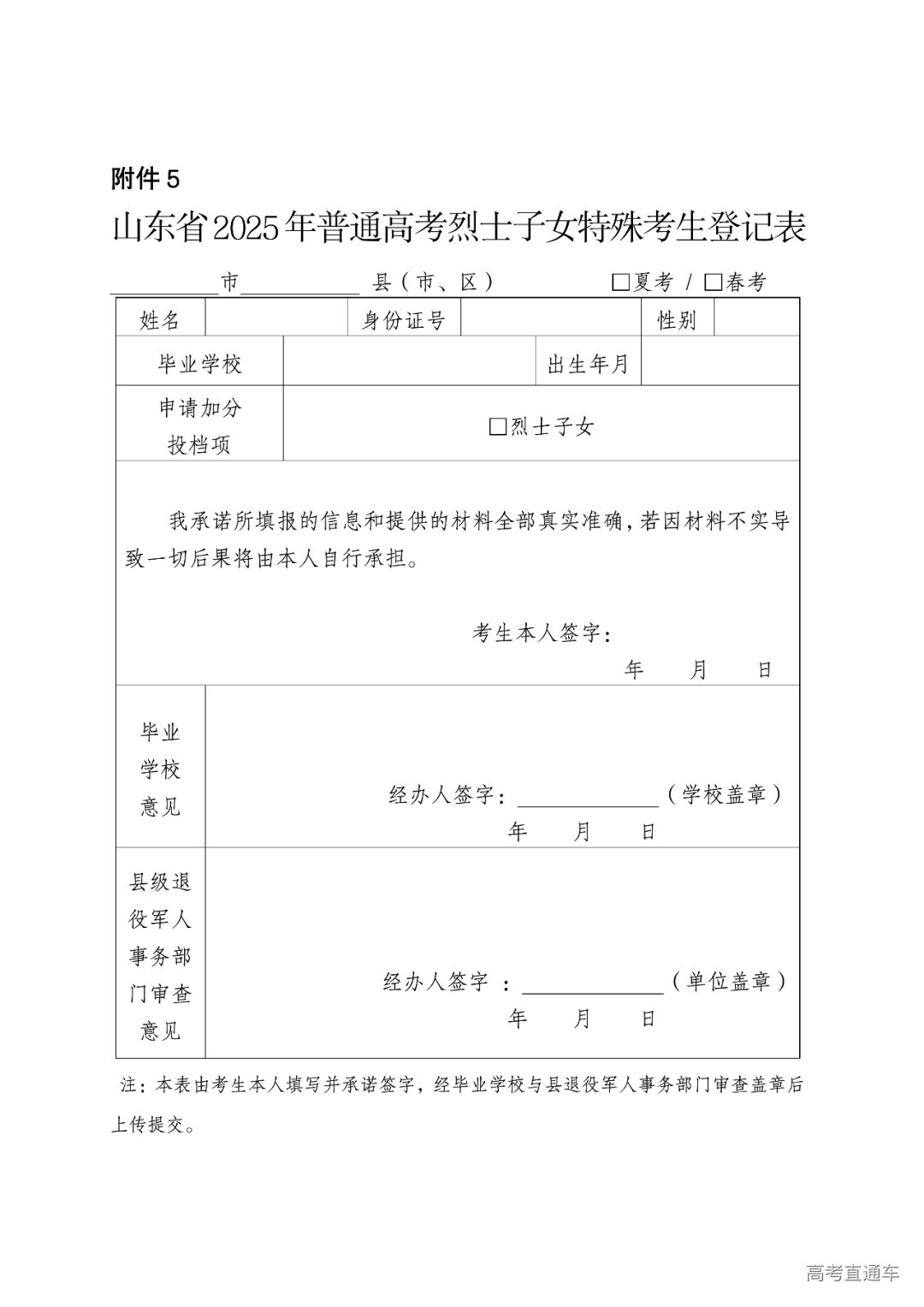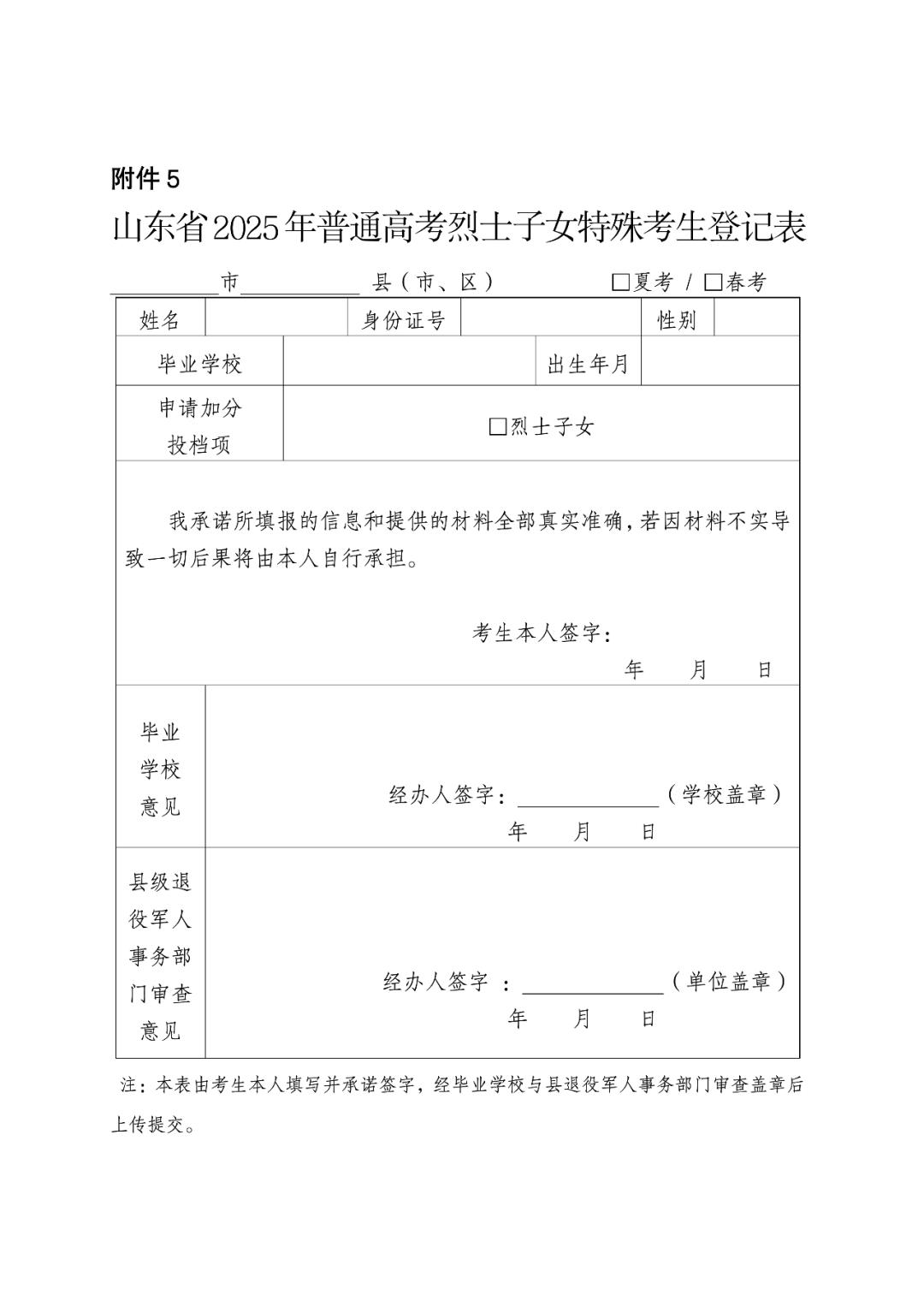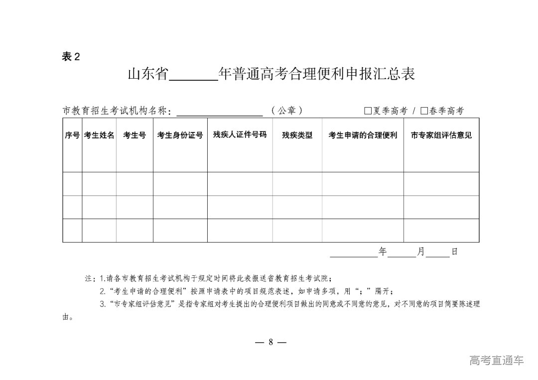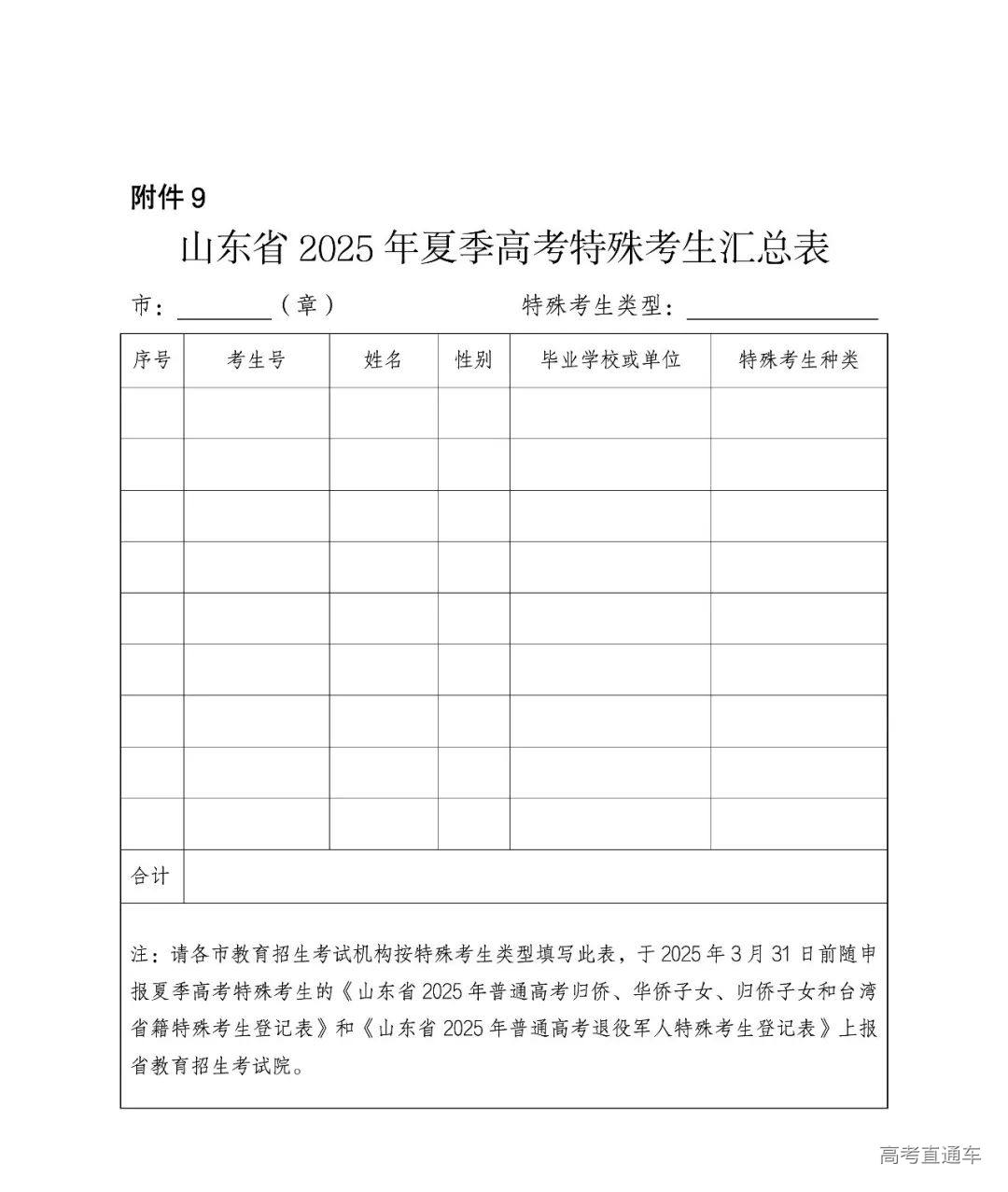 《山东省2025年夏季高考特殊考生汇总表》(附件9)、各类申请享受高考录取照顾政策考生的登记表及相关证明材料的电子版区分春季高考和夏季高考报省教育招生考试院。