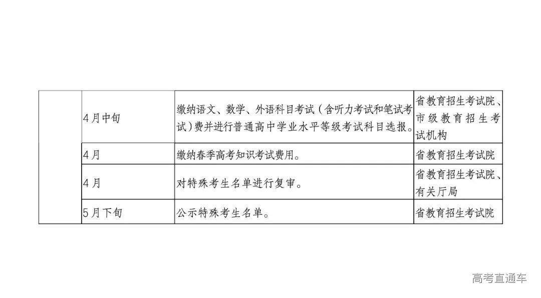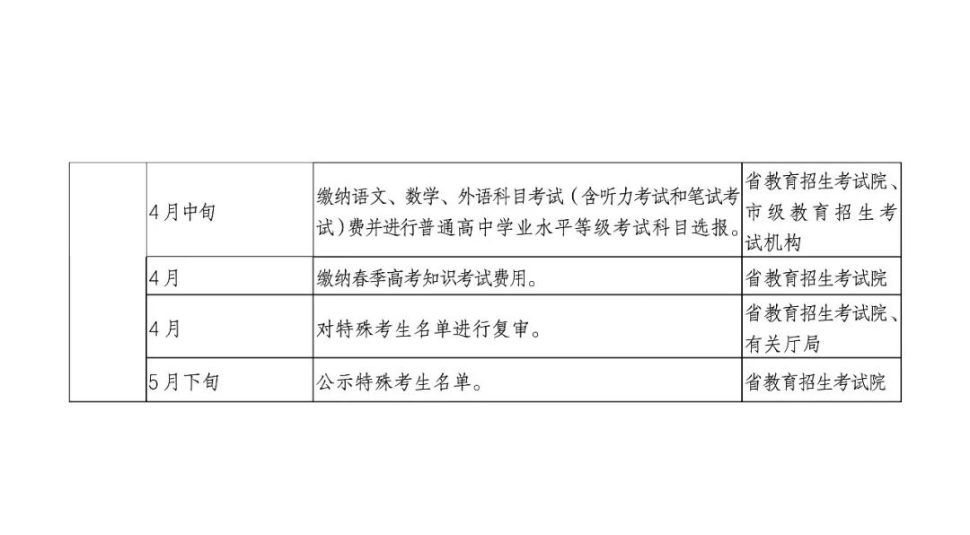 以上4类特殊考生材料,如有上传材料不齐全、不清晰、不完整等问题,县级教育招生考试机构应主动联系考生,逐一核实或补充材料,审核完成后县级教育招生考试机构应上报一份,保留一份(至少保存一年),并将最终审核通过的考生申报材料放入考生档案。上报工作安排如下:2025年3月31日前,市级教育招生考试机构将《山东省2025年春季高考特殊考生汇总表》(附件8)