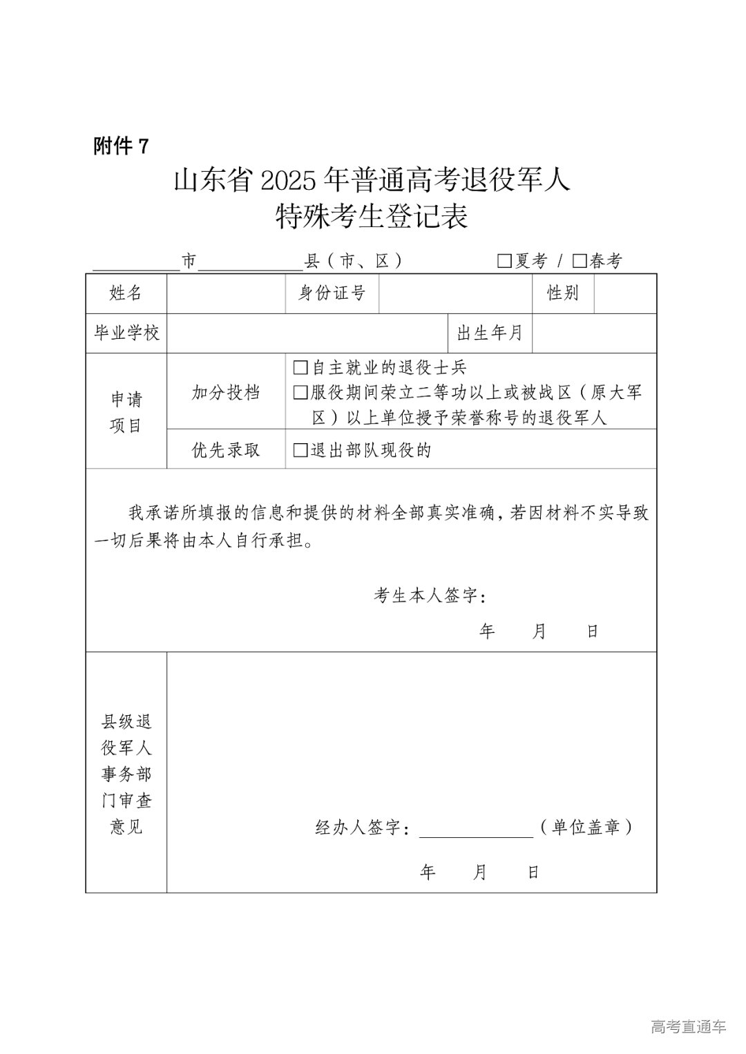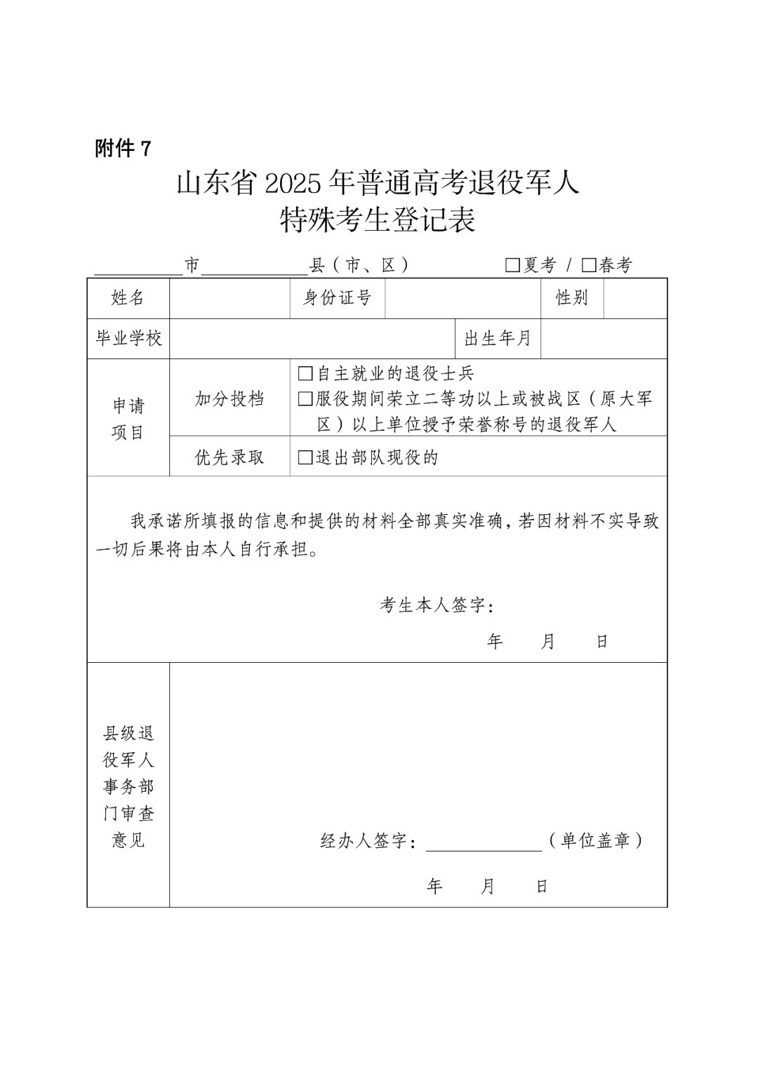 (1)申报。相关考生应填写《山东省2025年普通高考退役军人特殊考生登记表》(见附件7,以下简称《退役军人登记表》),并经县级退役军人事务部门审核盖章。在网上填报信息时应上传《退役军人登记表》、退役证、自主就业证明或立功证明。