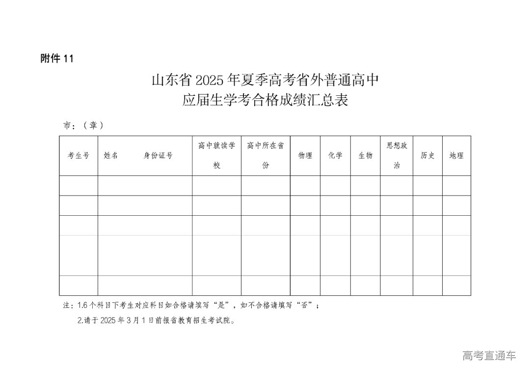 具有我省户籍且学籍在省外普通高中的应届毕业生报考夏季高考,在网上信息填报时应上传学籍所在省份县级教育行政部门出具的高中学籍证明,并上传高中学籍所在省份省级教育相关部门出具的普通高中学业水平合格考试成绩证明。县级教育招生考试机构对考生上传提交的材料进行初审,初审通过的报市级教育招生考试机构进行复审和汇总,并于2025年3月1日前将《山东省2025年夏季高考省外高中应届生学考合格成绩汇总表》(附件11)报省教育招生考试院作为等级考试选考科目依据。