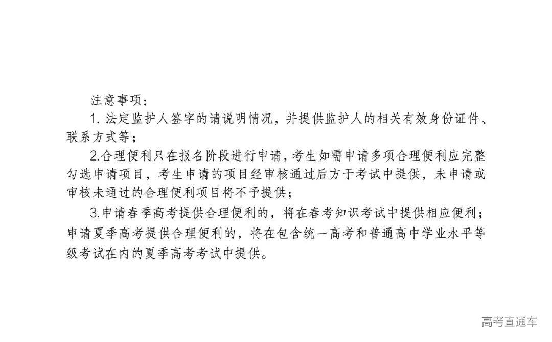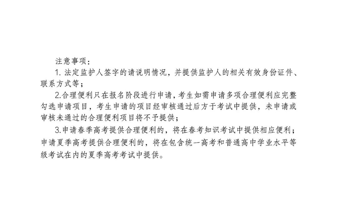 合理便利只在网上填报信息阶段进行网上申请,考生如需申请多项合理便利应完整勾选申请项目。考生申请的项目经审核通过后于考试中提供,未申请或审核未通过的项目将不予提供。申请春季高考合理便利的,将在春季高考知识考试中提供相应便利;申请夏季高考合理便利的,将在包含统一高考和普通高中学业水平等级考试在内的夏季高考考试中提供。