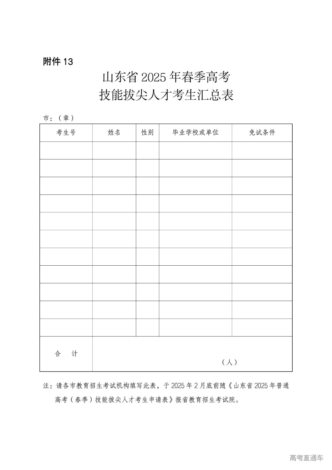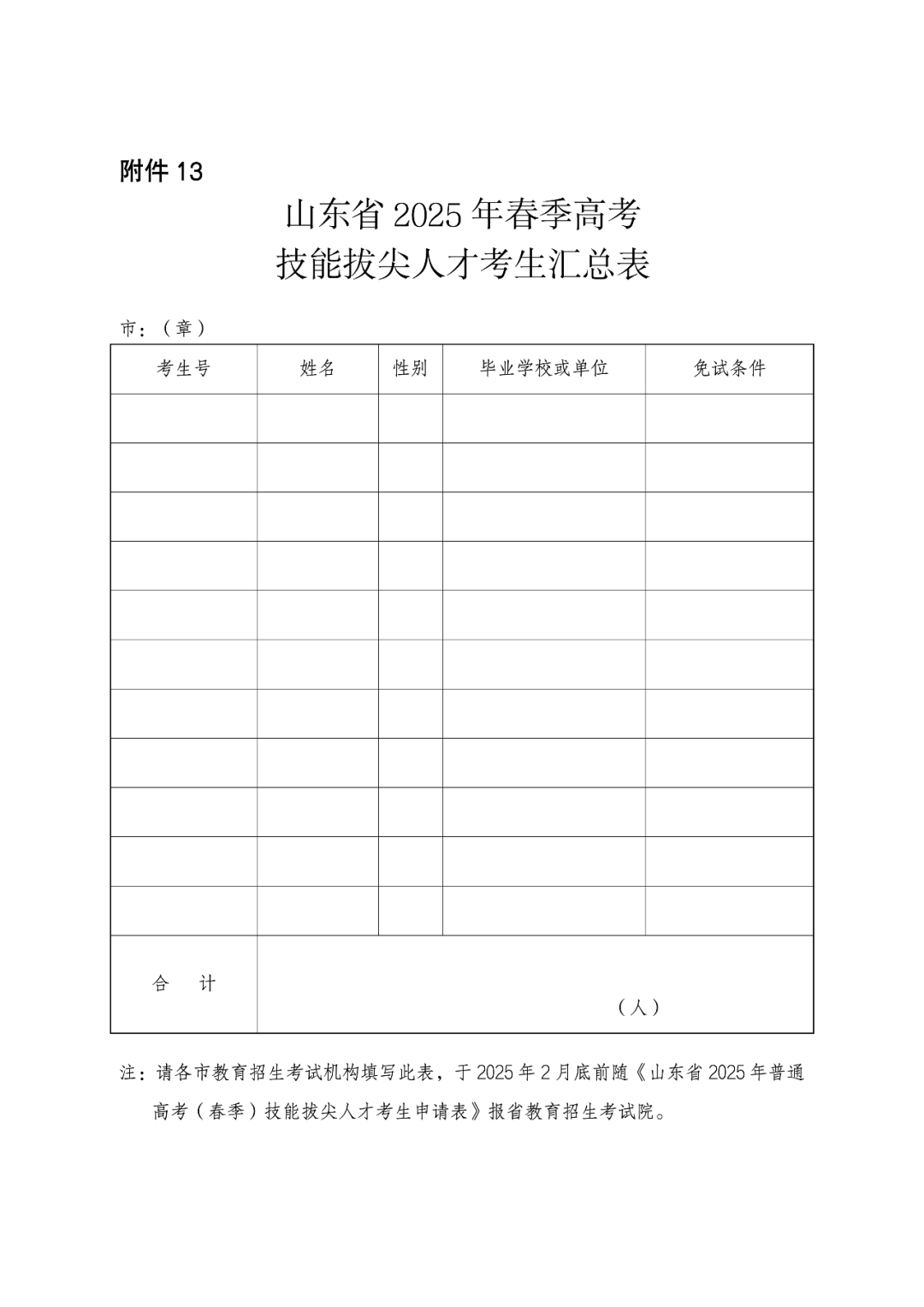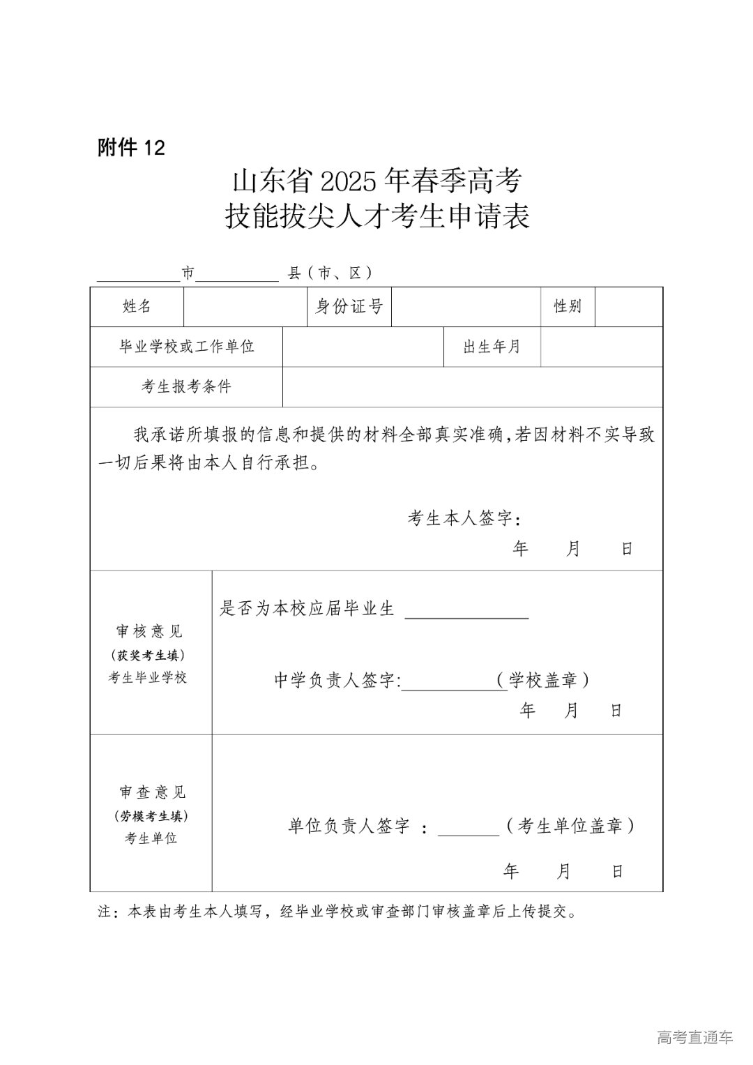 选择参加技能拔尖人才招生的考生须填写《山东省2025年春季高考技能拔尖人才考生申请表》(见附件12,以下简称《技能拔尖人才申请表》),并经所在单位或毕业学校审查盖章。考生在网上填报信息时须上传相关证明材料。