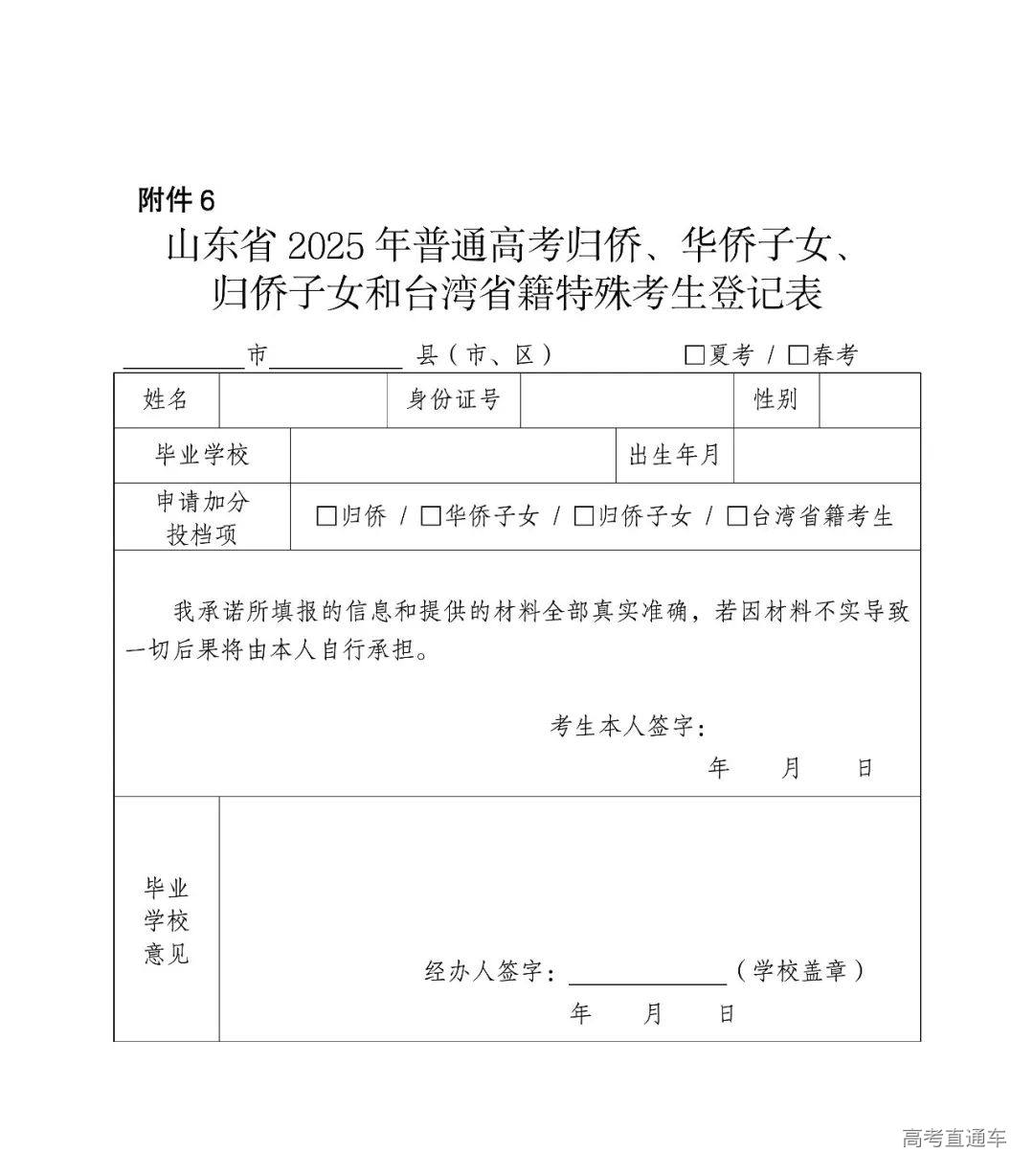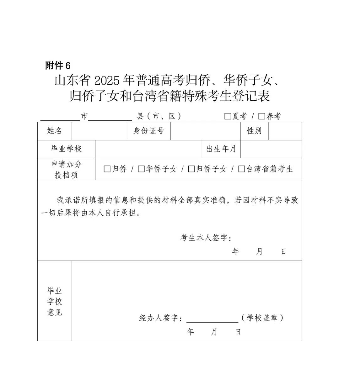 (1)申报。符合照顾条件的归侨、华侨子女、归侨子女和台湾省籍(含台湾户籍)考生,应填写《山东省2025年普通高考归侨、华侨子女、归侨子女和台湾省籍特殊考生登记表》(附件6,以下简称《登记表》),并经就读学校和县级统战部门审核盖章。在网上填报信息时应上传《登记表》、华侨或归侨或台湾省籍身份证明及亲子关系证明材料。
