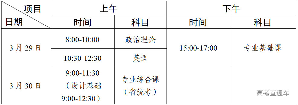 (一)2025年普通专升本考试科目共设4门,分别为2门公共课、1门专业基础课、1门专业综合课。公共课、专业基础课每科考试时间120分钟、卷面满分值100分;专业综合课每科考试时间150分钟(设计基础210分钟)、卷面满分值200分。