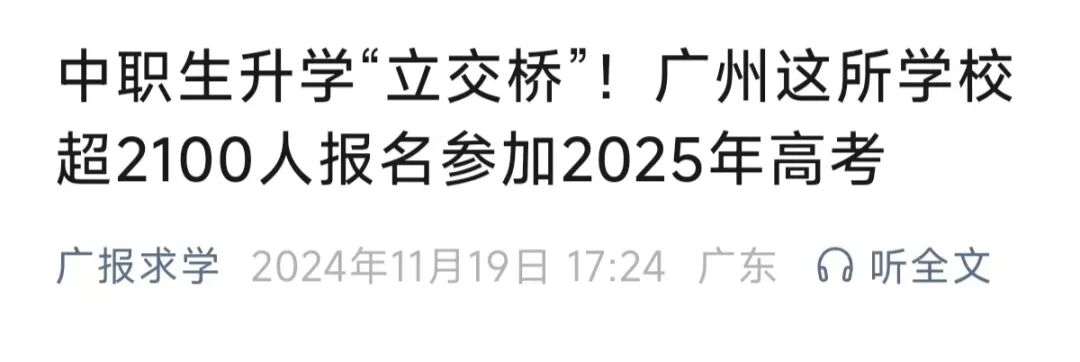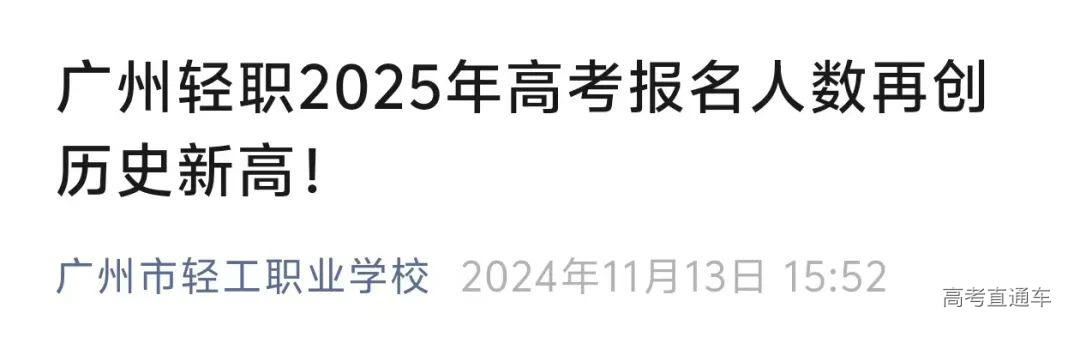 据广州市天河区一报名点“广州市轻工职业学校”官微消息,学校2025年高考报名人数为1292人,比2024年的1000人增长了292人,再创历史新高。