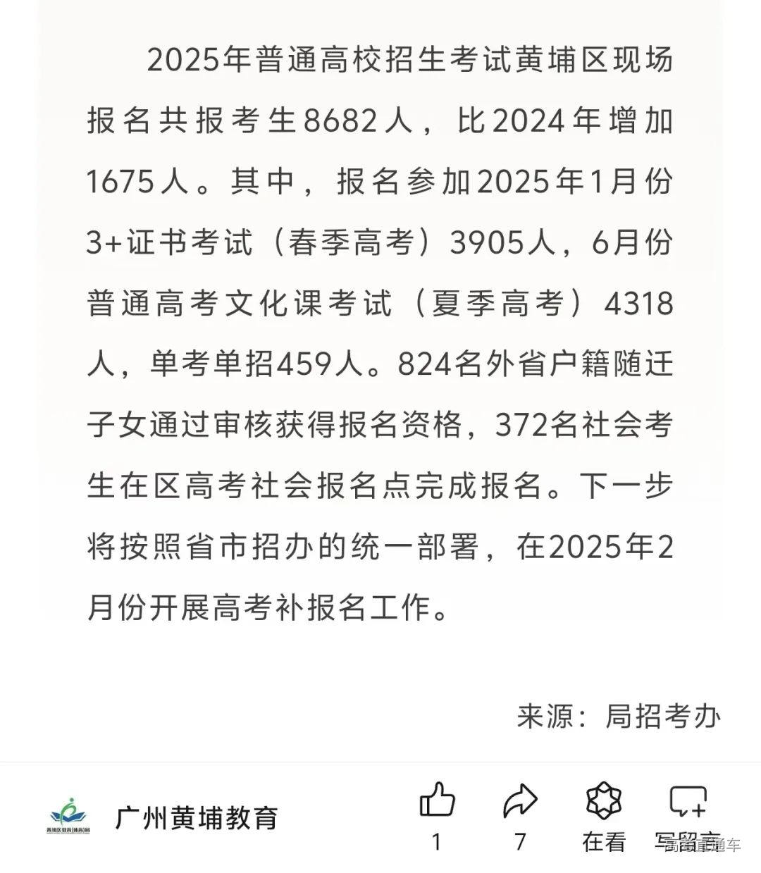 据“广州黄埔教育”最新消息,2025年普通高校招生考试黄埔区现场报名共报考生8682人,比2024年增加1675人。其中,报名参加2025年1月份3+证书考试(春季高考)3905人,6月份普通高考文化课考试(夏季高考)4318人,单考单招459人。