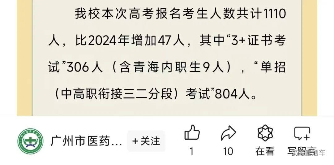 据广州市一报名点“广州市医药职业学校”官微消息,学校本次高考报名考生人数共计1110人,比2024年增加47人,其中“3+证书考试”306人(含青海内职生9人),“单招(中高职衔接三二分段)考试”804人。