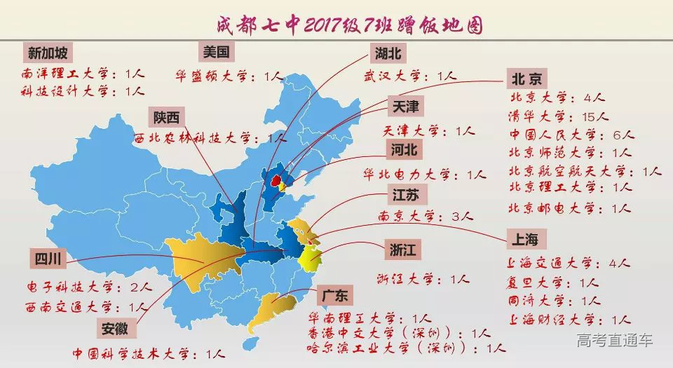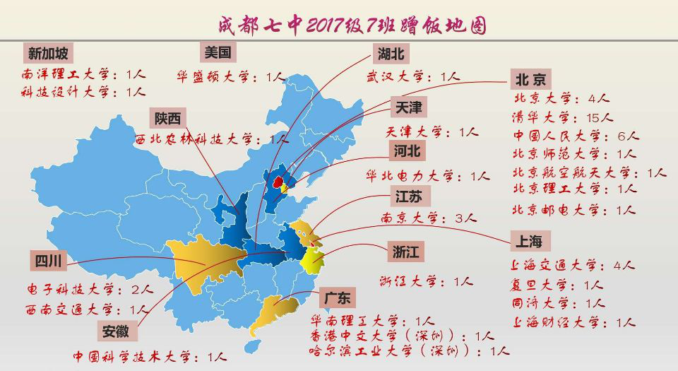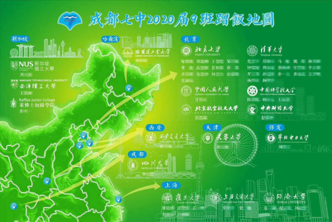 据热心家长分享的蹭饭地图来看,七中林荫创新实验班9班共有13个北大,17个清华,几乎占去了整个学校一半的名额,而7班则有4个北大,15个清华,也是实力不容小觑。