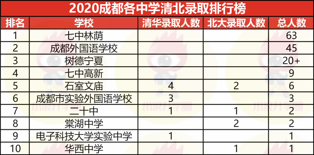 成都各学校也是捷报频传,小浪根据各校官网及热心家长所提供的信息,收集整理出2020年成都各中学清北录取排行榜。