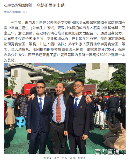 成都石室中学理科考生张家杰总分718分 双胞胎哥张家豪获705分