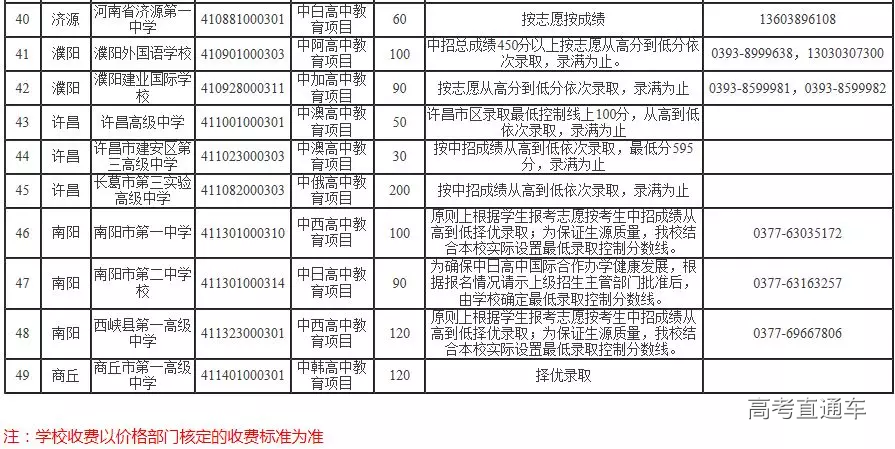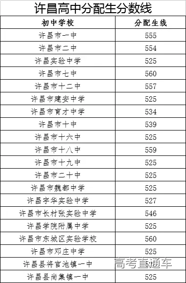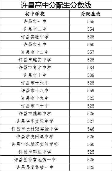 许昌高中今年统招生分数线为575分,面向全市招生的实验班分数线为557分。 今年分配生名额仍然按照统招生计划的50%执行。录取办法是录取分数线下降50分,在具有分配生资格的学生中,依照从高分到低分的原则录取分配生,直至完成录取指标,分配生指标不得突破。