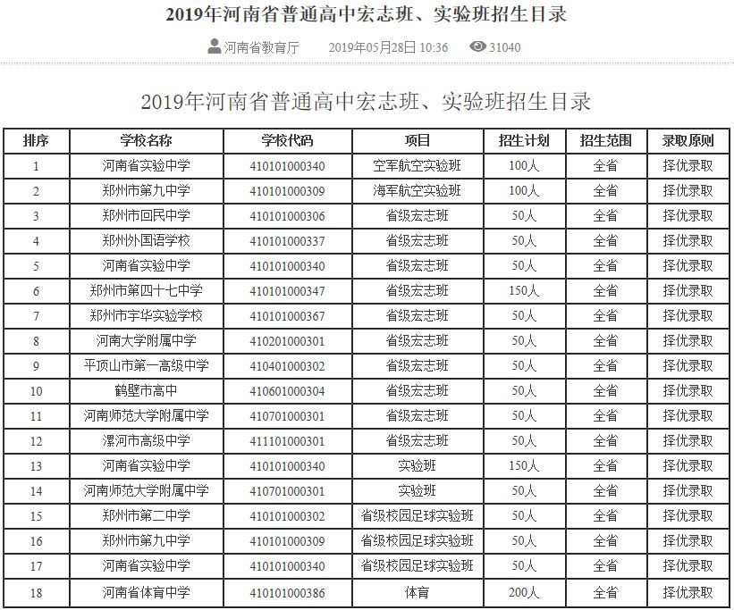 省提前批录取批次设置: ①7月12日:省提前批第一批次(省实验空军航空班、郑州九中海军航空班)录取; ②7月14日:省提前批第二批次录取招生目录(点击看大图); ③7月17日:省提前批第三批次录取招生目录; 河南省中招录取规则如下: ①先进行省提前批次的录取,录取结束后,再进行市统招的录取。 ②被省提前批次录取后,不再参与后面批次的录取工作。 ③提前批次未被录取,则按照当地的统录政策参与划线录取工作。