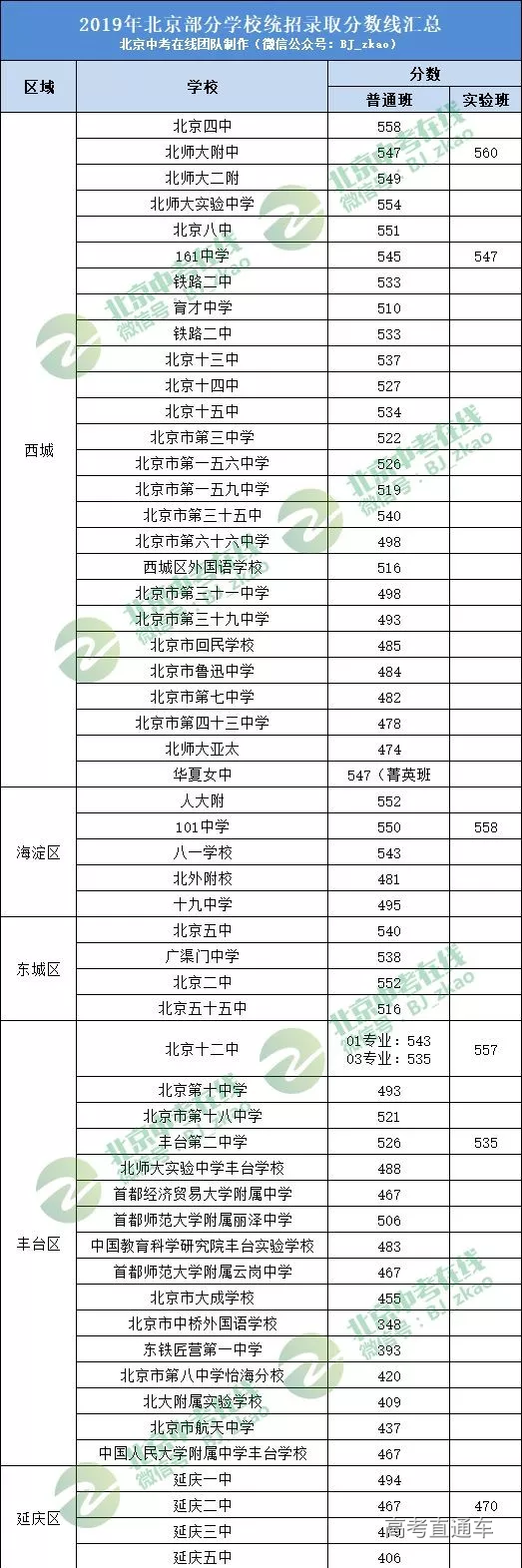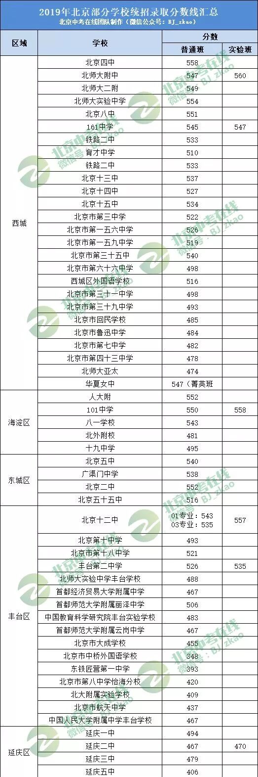 四中:558、实验:554、八中:551、二附:549、师大附:547(钱班560)、华夏:547(菁英班)、一六一 :545(实验班547)、三十五:540、十三中:537、十五中:534、铁路二:533、十四中:527、一五六:526、三中:522、一五九:519、西外:516、育才:510、四十四:509、六十六:498、三十一:498、三十九:493、回民:485、七中:482、43中:478、亚太实验 474