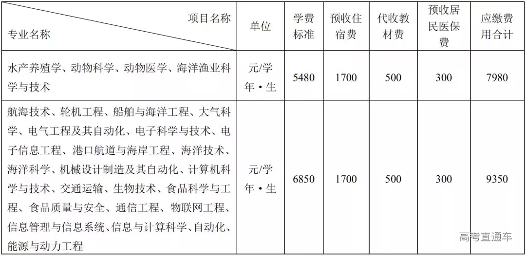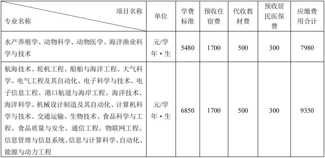 号)的规定,学生在校期间参保个人应缴纳的居民医保费纳入学校代收费项目,与学费一并收取,2019年预收居民医保费为每生300元,最终以政府定价为准,多退少补。 7. 新同学来校报到后,在入学教育期间以班为单位向保险公司自愿购买学生医疗补充保险,以保障居民医保保险理赔范围之外的伤残、意外等补充赔付的连续性,减轻当事学生重大病症时对本人及家长带来的经济压力。以学校招标的保险公司中标标的为准收取保费。 九、缴交学杂费方式为了方便新生缴交学杂费,学校与中国建设银行湛江市分行合作,采取从银行储蓄卡统一划扣方式收取学费、住宿费及教材费等,有关注意事宜如下: (一) 在收到与录取通知书一同寄出的有关缴费资料后,请先检查资料是否齐全(资料内含有建行储蓄卡、中国建设银行安全用卡小常识),仔细阅读中国建设银行告知书后按提示操作,入学报到后将签名确认的中国建设银行告知书及身份证复印件交到所在学院学生工作办公室。 (二) 存(汇)款指引:新生应在9月5日前按《缴费标准表》公布的各项收费标准的合计数,将款额存(汇)入上述储蓄卡帐号。注:储蓄卡帐户余额必须比应缴合计数多20元以上,如应缴5000元,则储蓄卡的余额应在5020元以上。 存(汇)款的具体流程: 1. 本地(指湛江市五县四区)籍学生: 在上述地区建行网点将应缴学杂费存入储蓄卡。 2. 外地籍学生(指非湛江地区学生): (1)在当地的建行网点办理汇款。需携带本人身份证和建行储蓄卡到当地建设银行网点,按以下内容填写“存款凭条”: 收款人户名:学生姓名 收款人账(卡)号:建行储蓄卡卡号 存入金额:多出需缴交的款项合计金额20元以上 (2)在当地的其他银行(即非建设银行)办理汇款。 携带本人身份证可到当地其他银行通过汇款方式将应缴学杂费汇入建行储蓄卡上,并按以下内容填写该银行的汇款凭证(请勿通过邮局汇款): 收款人户名:学生姓名 收款人账(卡)号:建行储蓄卡卡号 汇款金额:多出需缴交的款项合计金额20元以上 汇入行名:中国建设银行股份有限公司湛江解放东路支行 (三) 学生报到时将不受理现场缴费业务,未在规定时间完成缴费的同学,报到后通过网上银行缴费系统自助缴费。 (四) 使用建行储蓄卡划扣缴费的同学,学费单据等学校打印后再统一发放。 十、新生军训必须穿军训服。学校在新生接待现场设有销售点,每套7件(含上衣、裤、帽、鞋、腰带、帽徽、领徽),由新生自愿选购。 十一、请在旅途中提高警惕,注意安全。认真保管好各种证件、财物、防止失窃,以防意外,随身携带现金不宜过多。日后如需用款,可由家里汇入个人银行卡。湖光校区校园内、海滨校区和霞山校区附近都设有中国银行、中国建设银行、中国工商银行的ATM自动取款机。 十二、我校采取下列措施,帮助家庭经济困难学生。 (一) 国家助学金、国家励志奖学金和国家奖学金。家庭经济困难学生入学后可申请国家助学金;品学兼优的家庭经济困难学生,从二年级起可申请国家励志奖学金;特别优秀的学生,从二年级起可申请国家奖学金。 (二) 优秀学生奖学金。学校优秀学生奖学金获奖面目前为30%,奖学金分一、二、三等,分别为2000元、1000元、800元。 (三) 社会奖助学金。由社会企事业单位或个人捐资,在我校设立的各类金额不等的奖学金、助学金。 (四) 国家助学贷款。国家助学贷款包括生源地信用助学贷款和校园地国家助学贷款,家庭经济困难学生可申请生源地信用助学贷款或校园地国家助学贷款(入学后,被认定为家庭经济困难的学生可登录国家助学贷款系统进行申请)。 (五) 勤工助学。学生可以申请参加勤工助学活动,通过利用课余时间参加学校组织的勤工助学活动,获取劳动报酬,解决部分生活费用。 (六) 临时困难补助。学生在校学习期间,因突发事件导致暂时性经济困难,可申请临时困难补助。 广东海洋大学严格遵照国家有关规定、多措并举、多方资助,确保不让一个学生因家庭经济困难而失学。 十三、学校设有2个报到地点,分别是湖光校区和海滨校区,不同专业报到地点不同,在新生报到日期内(9月11日7:00至22:00) 学校在湛江南站(火车站)、湛江西站(高铁站)、湛江霞山汽车站(南站)和赤坎海田汽车总站均设有新生接待站。新生到湛江后若找不到接待站,可自行乘车到我校霞山校区(湛江市霞山区解放东路40号),霞山校区有校车送至湖光校区和海滨校区。 需乘坐火车或高铁来湛江的新生,请登录12306网站查询最新的时刻表。广东省汽车客运站(广州火车站旁)至湛江直达大巴首班车时间7:00,末班车时间23:50,每半小时一班车,终点站为湛江海田汽车总站或湛江霞山汽车站(南站),行车时间约5.5小时。 到湖光校区报到的新生,可自行在霞山校区门口或火车站南站的公交站点乘9路公交车到湖光校区正门的公交站点下车。自驾车从广州茂名方向(沈海高速G15)来校报到的新生,可从官渡出口开往湛江市区,到市区后往霞山或湛江港方向到达霞山区,之后往湖光岩(世界地质公园)方向可到达湖光校区;也可以继续往海口方向行驶,在湛江港出口下高速,出收费站后直行约1公里后右转往湛江港、东海岛方向,沿疏港大道直行约15公里即可到湖光校区。 到海滨校区报到的新生,可自行乘2、20、22路公交车到422医院站(海滨校区旁)下车。自驾车从广州茂名方向(沈海高速G15)来学校报到的新生,