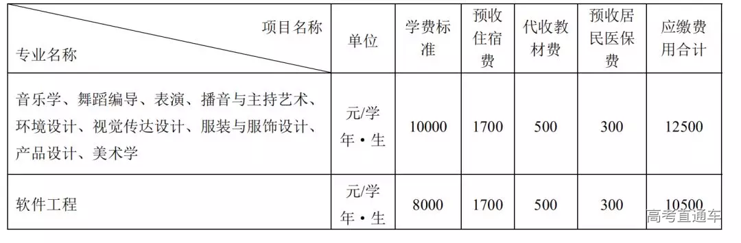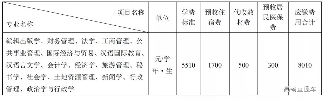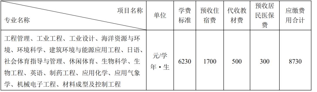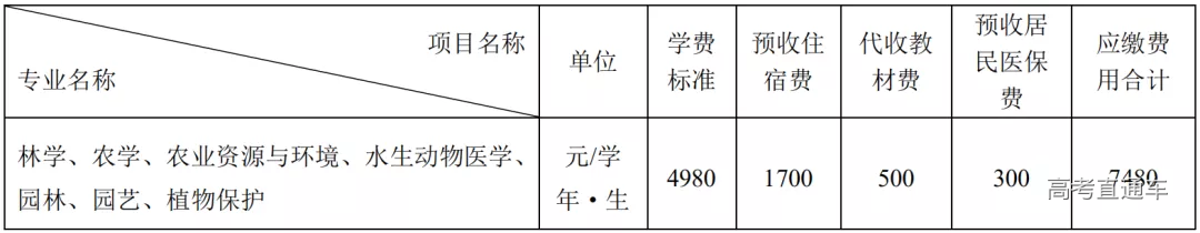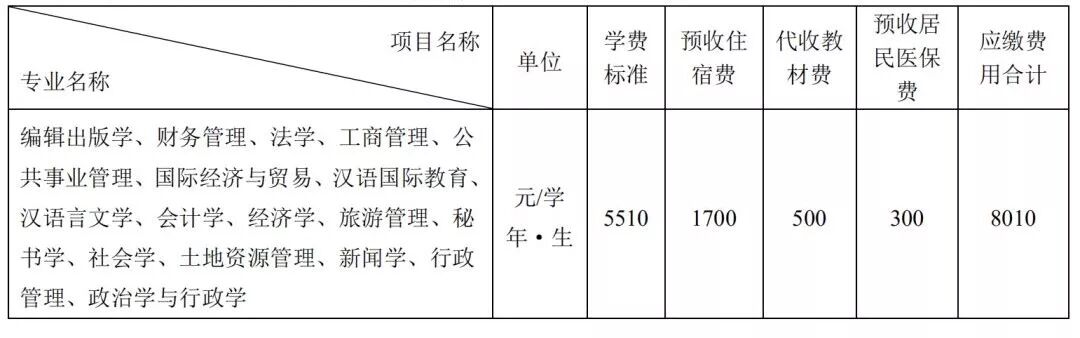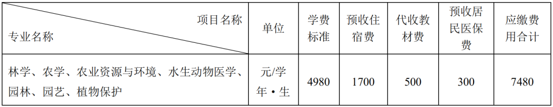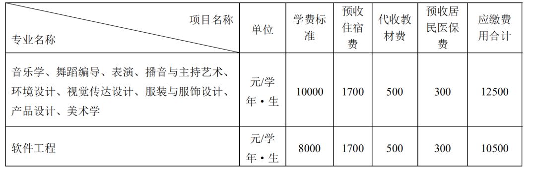 (二) 农林类专业学年缴费标准表 (三) 理工、外语、体育类专业学年缴费标准表 (四) 文史、财经、管理类专业学年缴费标准表 (五) 艺术、软件类专业学年缴费标准表 说明: 1. 应缴费用合计=对应所学专业学年学费标准+预收住宿费+代收教材费+预收居民医保费。 2. 住宿费统一收取,待入住宿舍后,按各宿舍收费标准多退少补。 3. 教材费为预收款,购书后按实际结算,多退少补。 4. 学生宿舍已全部安装空调,空调宿舍实际收费标准执行价格主管部门最终的核准标准。 5. 医疗补充保险由学校招标中标的保险公司来负责理赔,保费低,赔付保额高,建议学生购买。 6.